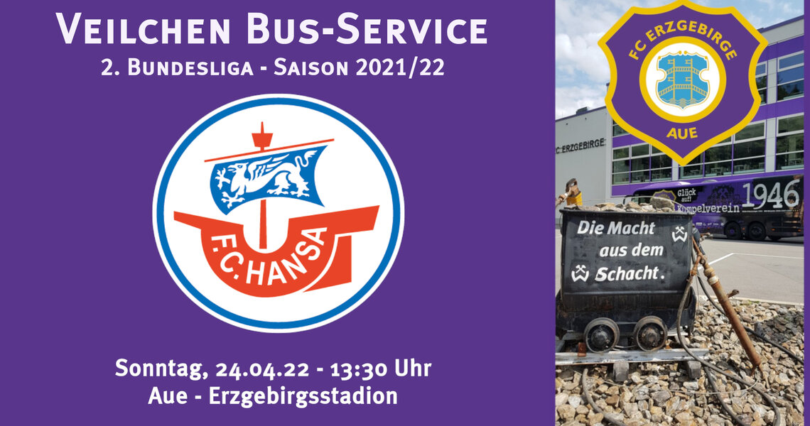 Zu unserem Heimspiel gegen den FC Hansa Rostock möchten wir unseren Fans wieder den Veilchen Bus-Service anbieten. Es werden die Busse auf den Linien 6 und 7 fahren. * Anmeldungen sind auch ...