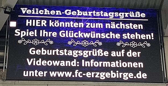 Glück Auf liebe Veilchenfans, es besteht auch in der kommenden Saison wieder die Möglichkeit, dass ihr eure persönlichen Geburtstagsglückwünsche exklusiv vor dem Spiel und zur Halbzeitpause auf ...