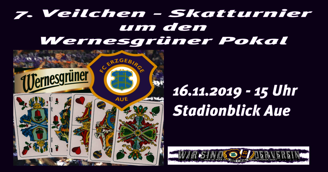 Wir möchten auch in diesem Jahr wieder alle interessierten Veilchen-Fans zum nunmehr 7. Veilchen-Skatturnier um den Wernesgrüner Pokal ganz herzlich ins Erzgebirgsstadion einladen. * unsere ...