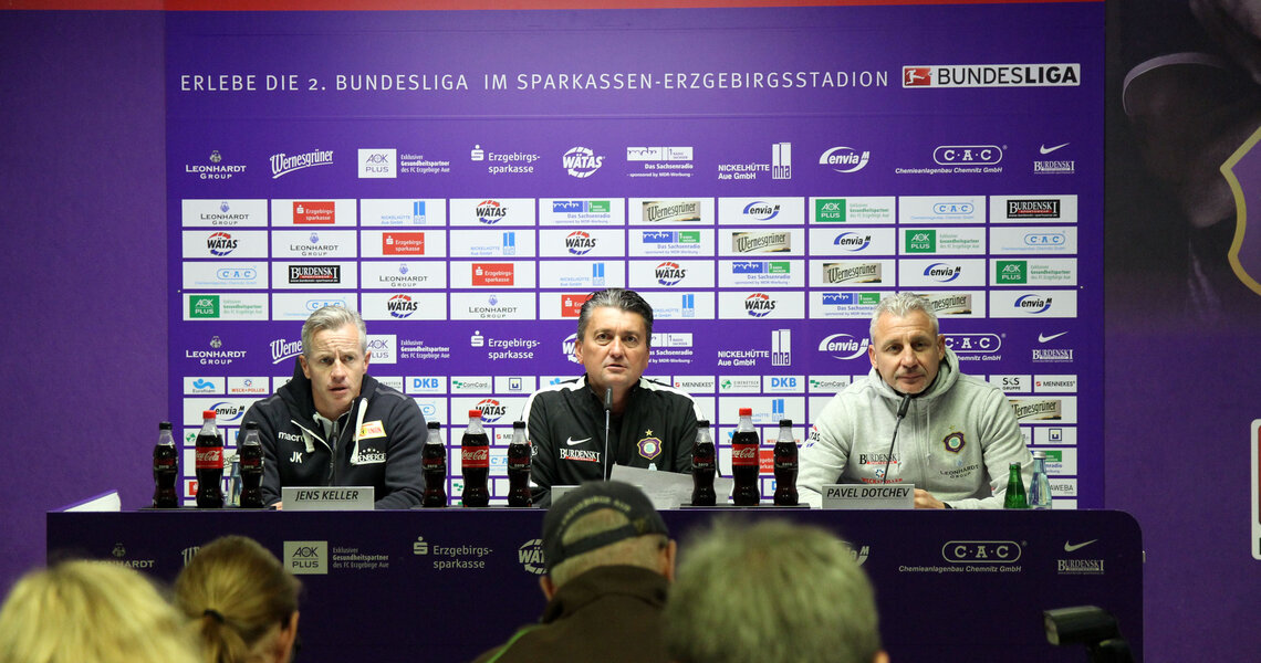 11. Spieltag FC Erzgebirge Aue - 1. FC Union Berlin 1:3 (1:1) Die Cheftrainer beider Mannschaften auf der Pressekonferenz nach dem Spiel UNION-CHEFCOACH JENS KELLER VEILCHEN-CHEFCOACH PAVEL ...