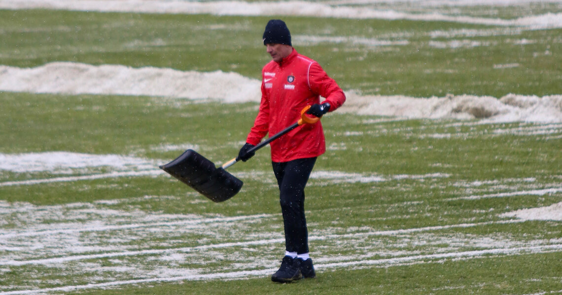Witterungsbedingt machne die sportlich Verantwortlichen des FC Erzgebirge Aue aus der Not eine Tugend, räumten gemeinsam mit der Stadionbrigade den Trainingsplatz vom Schnee.