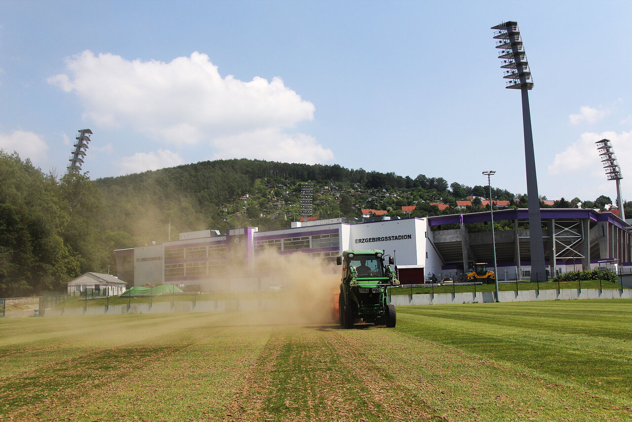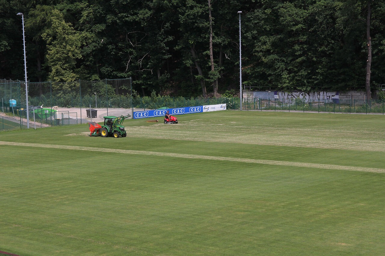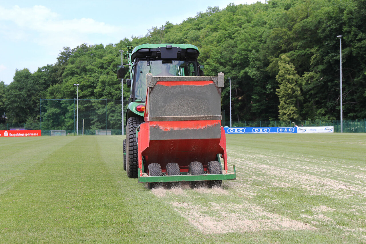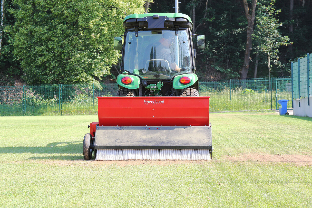 „Zuerst haben wir vertikutiert, damit wird der Rasen ausgedünnt und zum Beispiel Rasenfilz entfernt, der sich im Laufe einer Saison durch Rasenschnitt und andere organische Substanzen bildet.“, erklärt Greenkeeper Danilo Rauch. „Danach werden mit dem sogenannten 'Vertidrain Verfahren' Löcher (etwa 200 pro Quadratmeter) ins Grün gestochen (etwa 15 cm tief und 2 cm im Durchmesser), die im Anschluss zur Stabilisierung mit Quarzsand gefüllt werden. Dieses Verfahren führt zu einer besseren Wasserführung und Bodenbelüftung. Als Abschluss wird mit der Speed-Seed Maschine neuer Rasen ausgesät.“