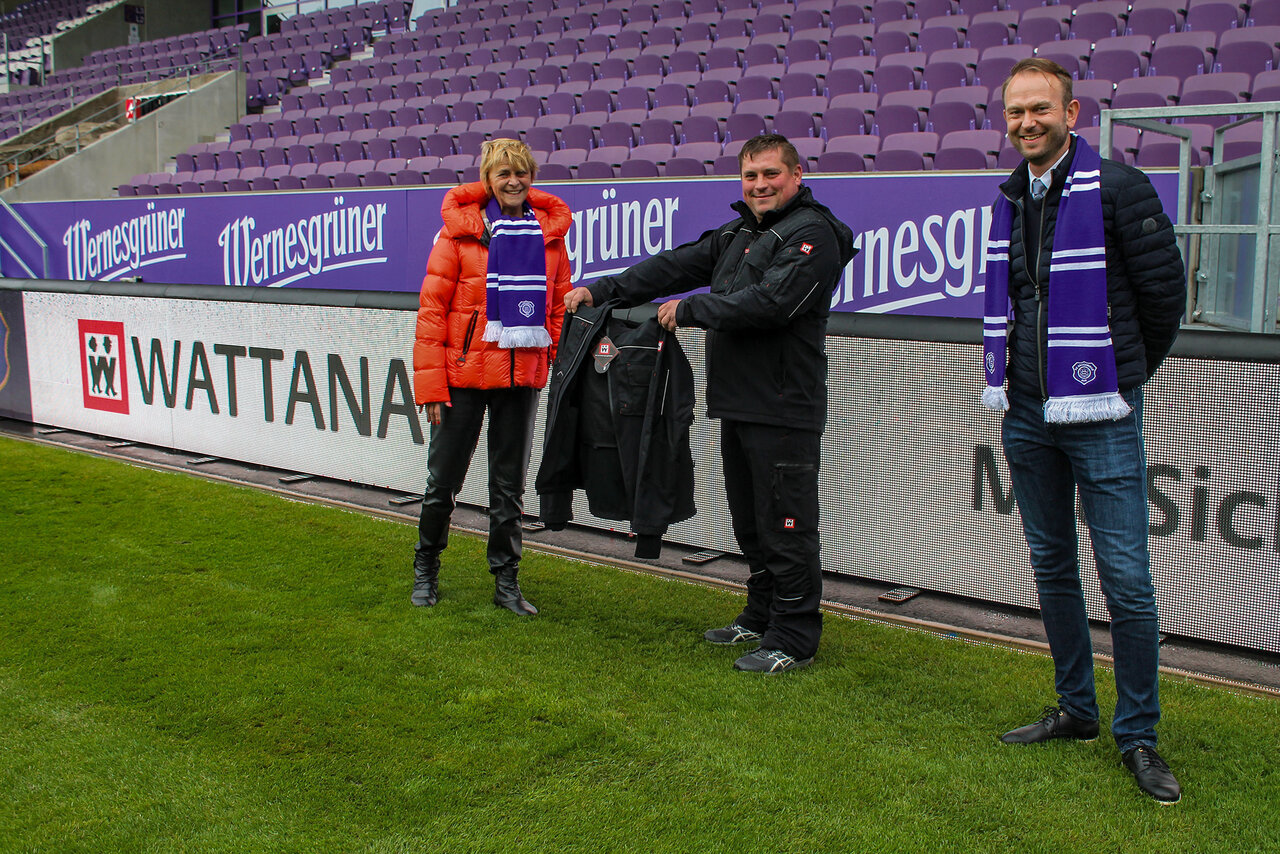Newsfoto: Gabriele Götze, Thomas Wild und Alexander Gerber wurden beim Aue-Besuch von Enrico Barth durchs Erzgebirgsstadion geführt. FCE-Marketingleiter und Stadionteam-Chef Alexander Sesser freut, dass Wattana den Co-Sponsorvertrag gleich um zwei Jahre verlängert hat.
