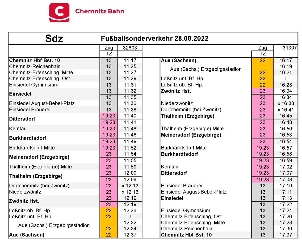Zusätzlich zum Regelbetrieb verkehrt am 28.08.2022 zwischen Chemnitz Hbf. und Aue (Sachsen) wieder ein Sonderzug für Veilchenfans der Linie C13, um dem erhöhten Besucheraufkommen der Fußball-Drittligabegegnung FC Erzgebirge Aue – SG Dynamo Dresden gerecht zu werden. Wir bitten unsere Veilchenfans auf diesen Sonderzug mit erhöhter Beförderungskapazität auszuweichen.