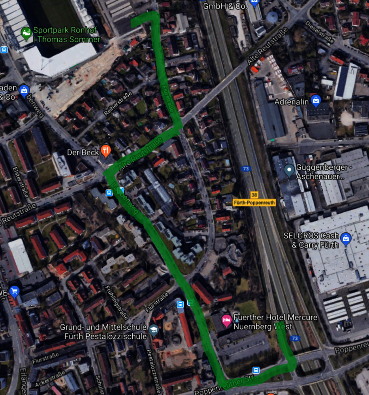 Gästefanbusse parken genau vor dem Gästeeingang am Stadion. Über die Ausfahrt Fürth-Poppenreuth der A73, den Laubenweg, Alte Reutstraße und der Flurstraße erreicht man den neuen Gästeparkplatz direkt am Eingang zum Stadion.