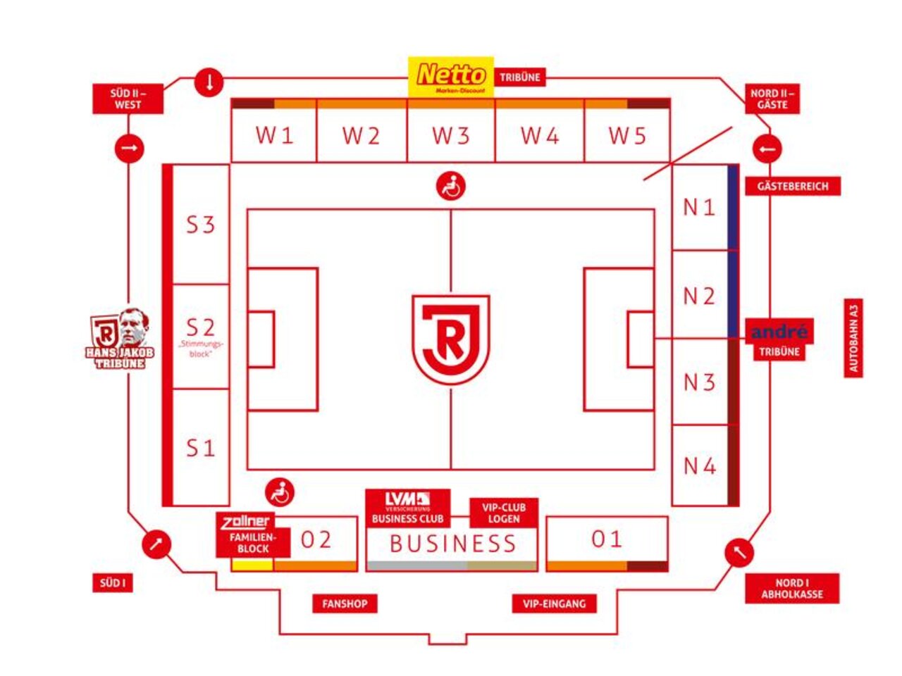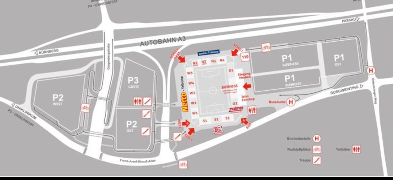 Das Stadion liegt unmittelbar an der Autobahn A3 (Ausfahrt 100a Regensburg-Universität).