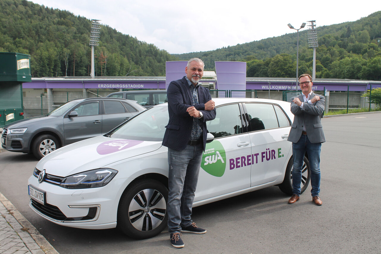 Die Stadtwerke Aue-Bad Schlema GmbH (SWA) bleibt für zwei weitere Jahre Premiumsponsor des FC Erzgebirge. Das besiegelten René Rücker, der neue Geschäftsführer des kommunalen Energieunternehmens, und FCE-Marketingleiter Enrico Barth am 5. August. Neben der finanziellen Unterstützung der Veilchen wird damit auch die Zusammenarbeit im Bereich der Nachwuchsausbildung, bei sozialen Aktionen in der Region und nachhaltigen Energieprojekten fortgeführt. Jüngstes Beispiel für Letzteres ist die in diesem Jahr zusammen mit der Auer Firma Clen Solar installierte großflächige Solaranlage auf dem Dach des Erzgebirgsstadions. So war es wohl auch kein Zufall, dass der SWA-Chef mit einem Elektro-VW-Golf der Stadtwerke zum Termin der Vertragsunterzeichnung fuhr.