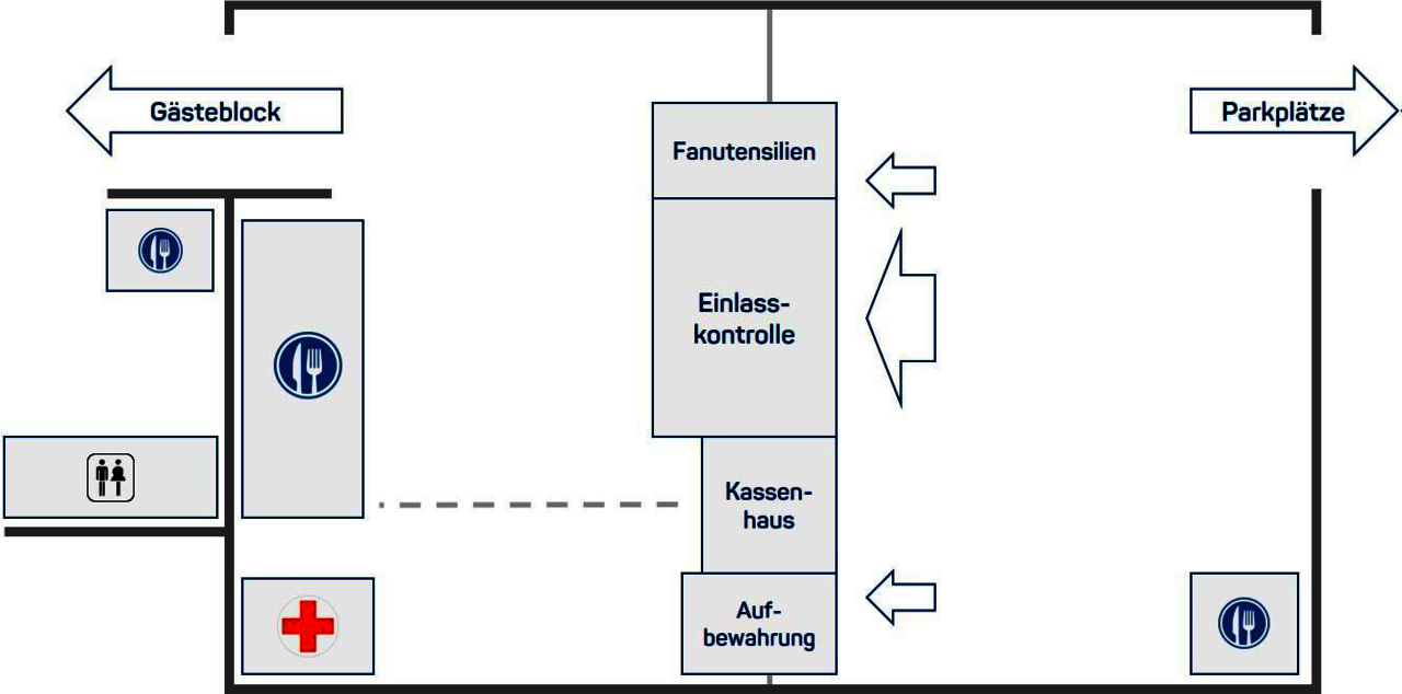 - Mitgeführte Fanutensilien (z.B. Fahnen, Trommeln) werden an den Einlassstellen durch den Ordnungsdienst in Augenschein genommen. Plant genügend Zeit ein, da auch hier keine Rücksicht in Bezug auf die Anstoßzeit genommen werden kann. Nutzt zudem den rechten Eingang der Vereinzelung.