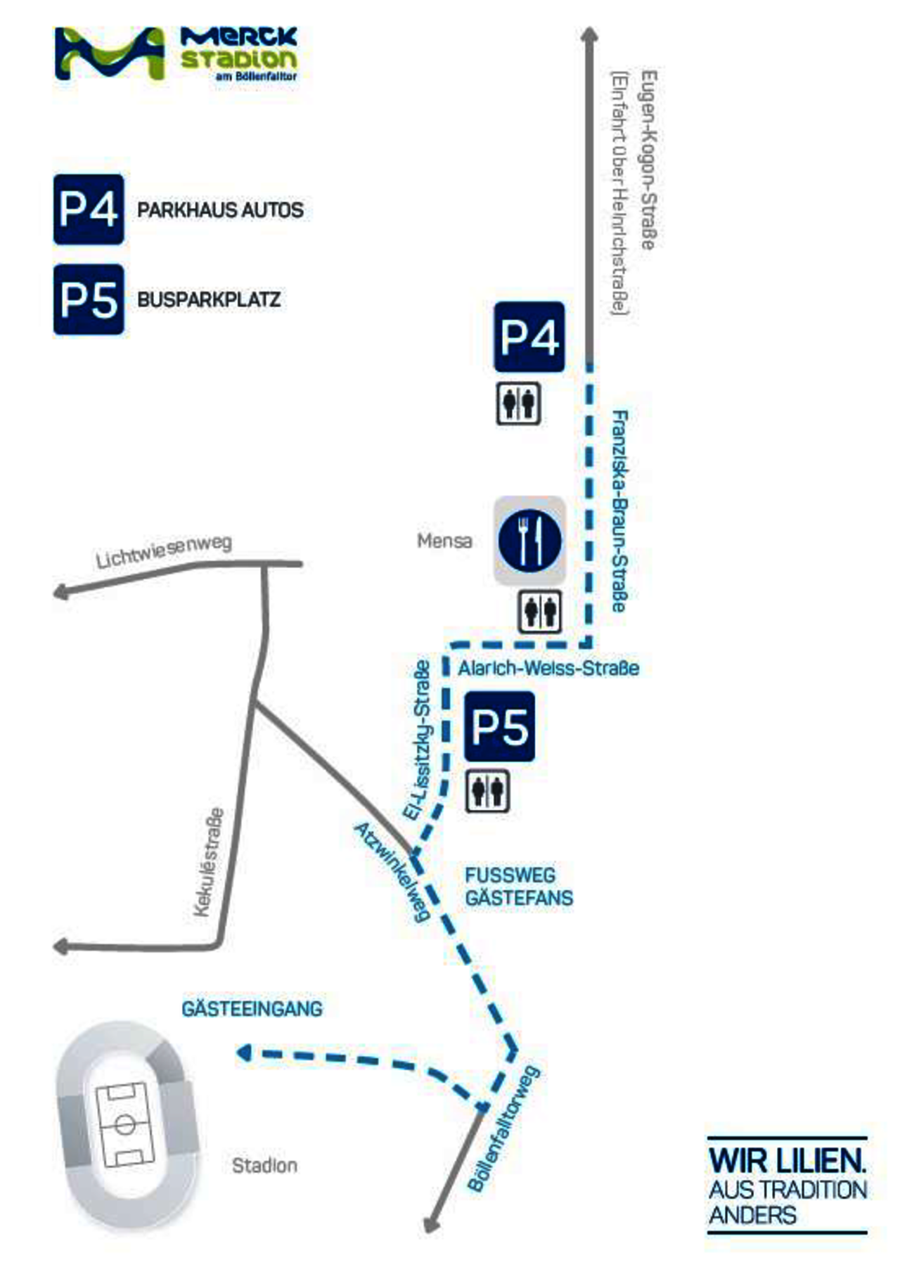Das Gästeparkhaus (P4) für Pkw befindet sich in der Eugen-Kogon-Straße (ehemals Petersenstraße). Die Zufahrt dorthin erfolgt über die Heinrichstraße. Aufgrund der Anmietung der Parkplätze bei der TU Darmstadt ist der SV Darmstadt zur Erhebung einer Parkgebühr verpflichtet. Die Parkgebühr für Pkw beträgt 5,- Euro. Busse parken auf dem Busparkplatz in der Alarich-Weiss-Straße (P5, Zufahrt ebenfalls über Heinrichstraße und Eugen-Kogon-Straße). Busse sind zu einer Parkgebühr von 20,- Euro verpflichtet. Bitte haltet die Gebühr bereit, um eine rasche Abwicklung zu gewährleisten. Von den Parkplätzen gelangt Ihr in 5-10 Minuten per Fuß zum Gästeblock (Zugang Waldkasse Nord). Bitte folgt den Ordnern, welche Euch den Weg weisen.