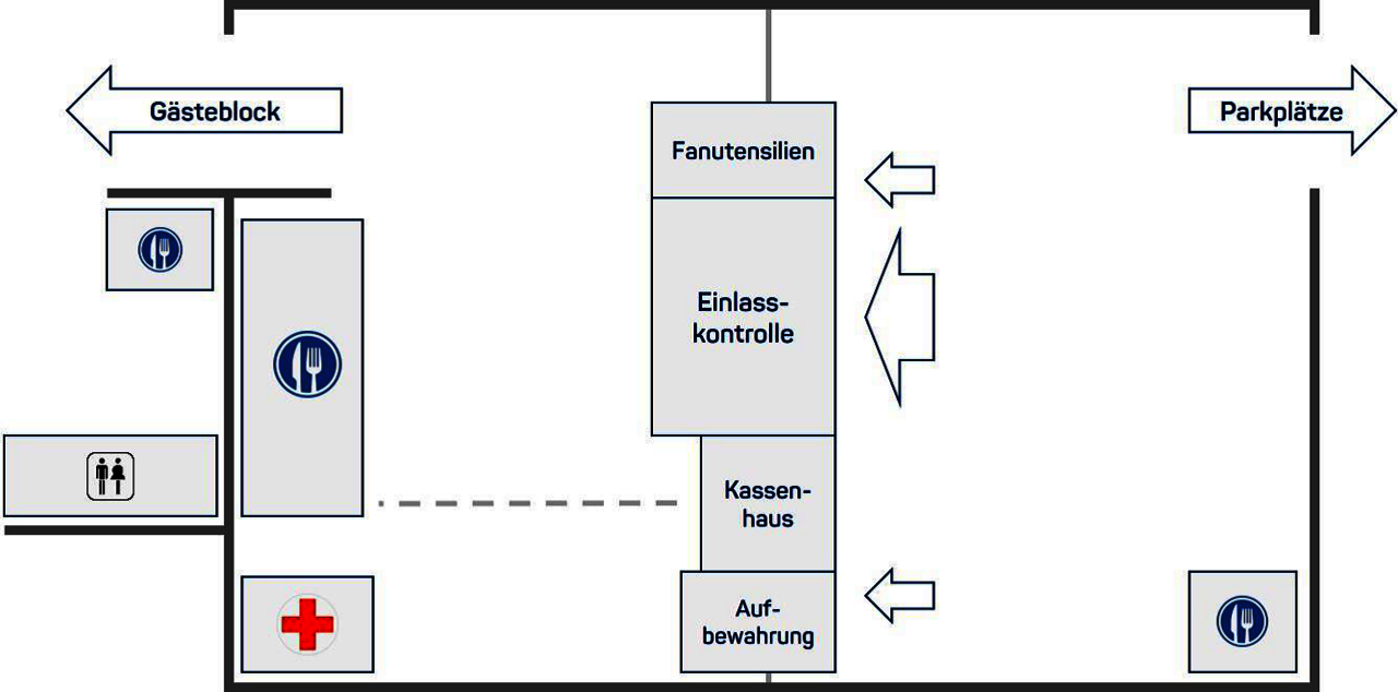 Der Gästeblock bei uns am Böllenfalltor.EinlasskontrollenHinweis zu den Einlasskontrollen:Fans mit oben genannten Fanutensilien müssen den rechten Eingang der Vereinzelung nutzen (siehe Grafik).