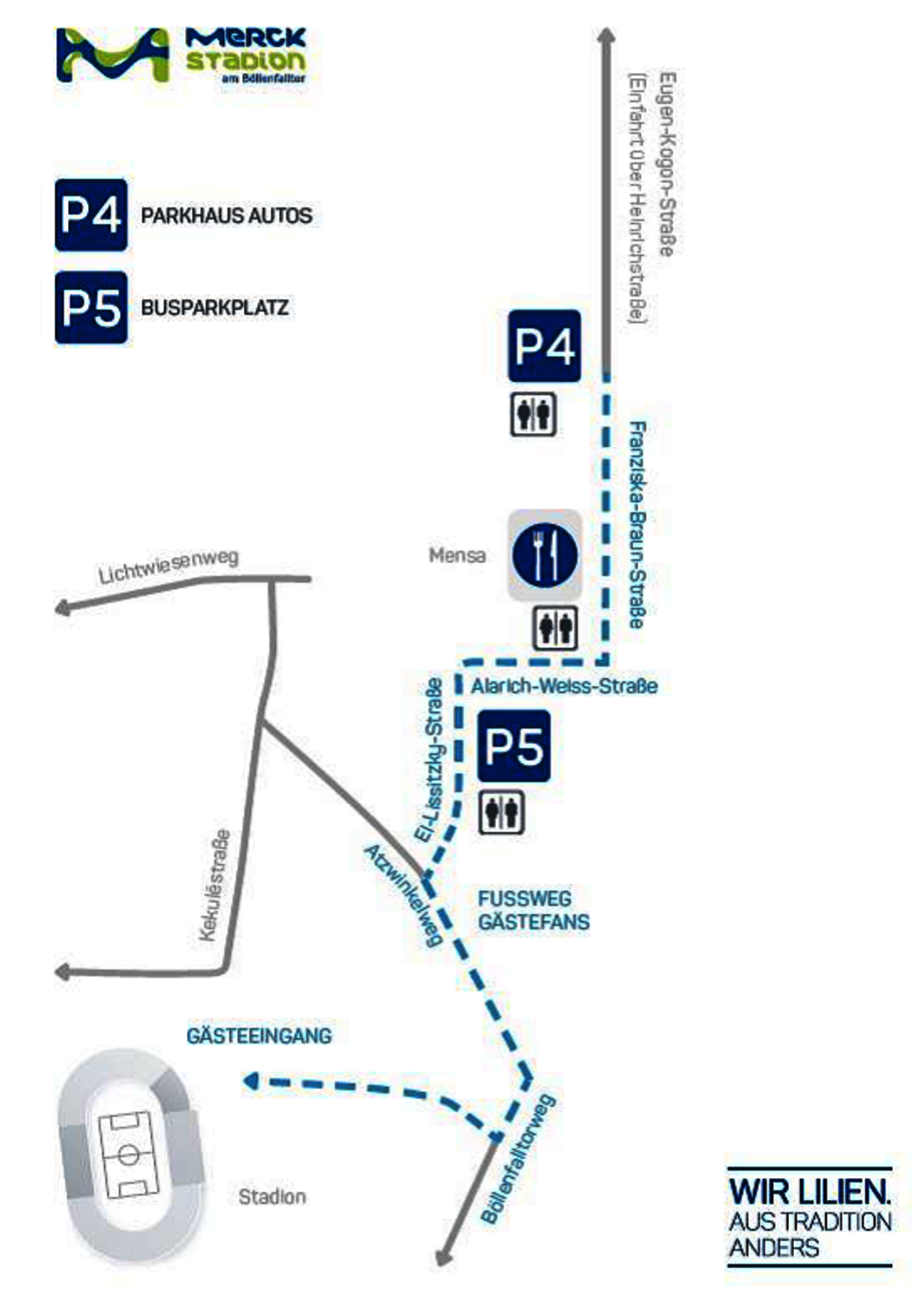 Anreise mit der Deutschen Bahn:Die Anreise mit der Bahn erfolgt per Regelzüge der Bahn AG bis zum Hauptbahnhof Darmstadt. Ab dort Umstieg in die VIAS-Odenwaldbahn in Richtung Groß-Umstadt/Wiebelsbach, bis zur Haltestelle TU-Lichtwiese. Nach einem Fußmarsch von ca. 15min erreicht Ihr den Gästeeingang des Stadions.