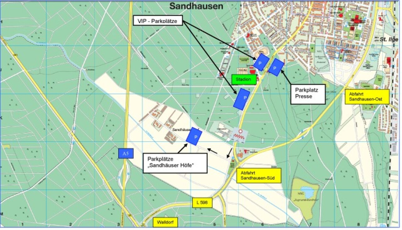 Parkmöglichkeiten Busse können auf dem Parkplatz „Sandhäuser Höfe“ in der Nähe zum Gästeeingang parken. Bei der Anreise aus Süden (Karlsruhe) oder Norden (Frankfurt), wie auch aus Osten (Heilbronn) bitte die Ausfahrt der A5 Walldorf/ Wiesloch benutzen - Nach dem Verlassen der Autobahn bitte in Richtung Walldorf / Heidelberg / Sandhausen weiterfahren. Wenn Walldorf passiert worden ist, die Ausfahrt Sandhausen-Süd zu den öffentlichen Parkplätzen "Sandhäuser Höfe" benutzen. Die PKWs parken ebenfalls auf dem Parkplatz „Sandhäuser Höfe“. Von dort geht es zu Fuß in Richtung des Gästeeingangs (ca. 5 Minuten). Rollstuhlfahrer Leider gibt es im Gästebereich keine Stellplätze für Rollstuhlfahrer. Weitere Informationen hierzu erhalten Sie auf der Geschäftsstelle des SV Sandhausen unter 06224 827 900 40.