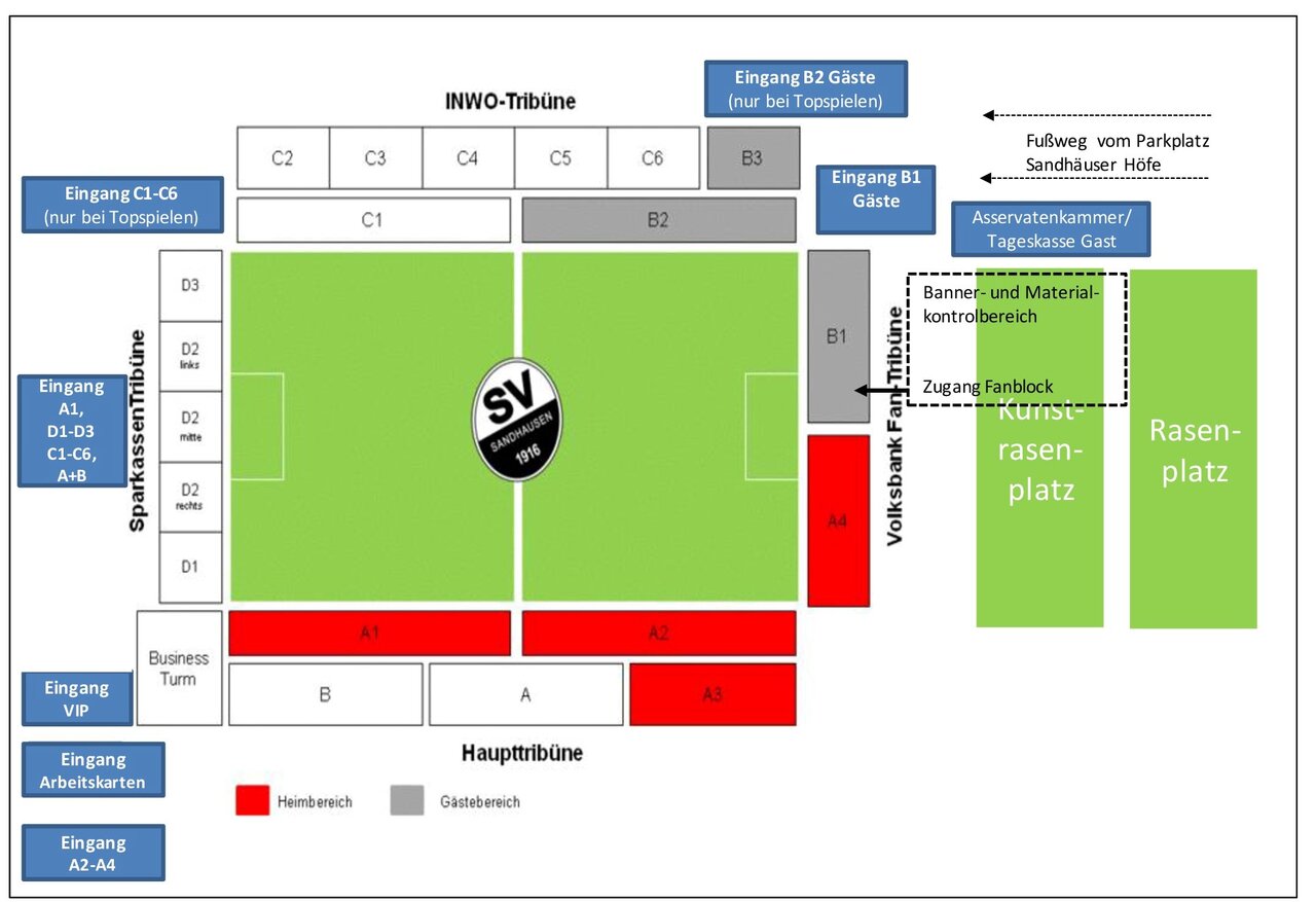Für Gästefans steht der Parkplatz „Sandhäuser Höfe“ zur Verfügung. Hier können sowohl PKW, 9-Sitzer als auch Busse parken. (Adresse für das Navigationsgerät: „Sandhäuser Hof“).