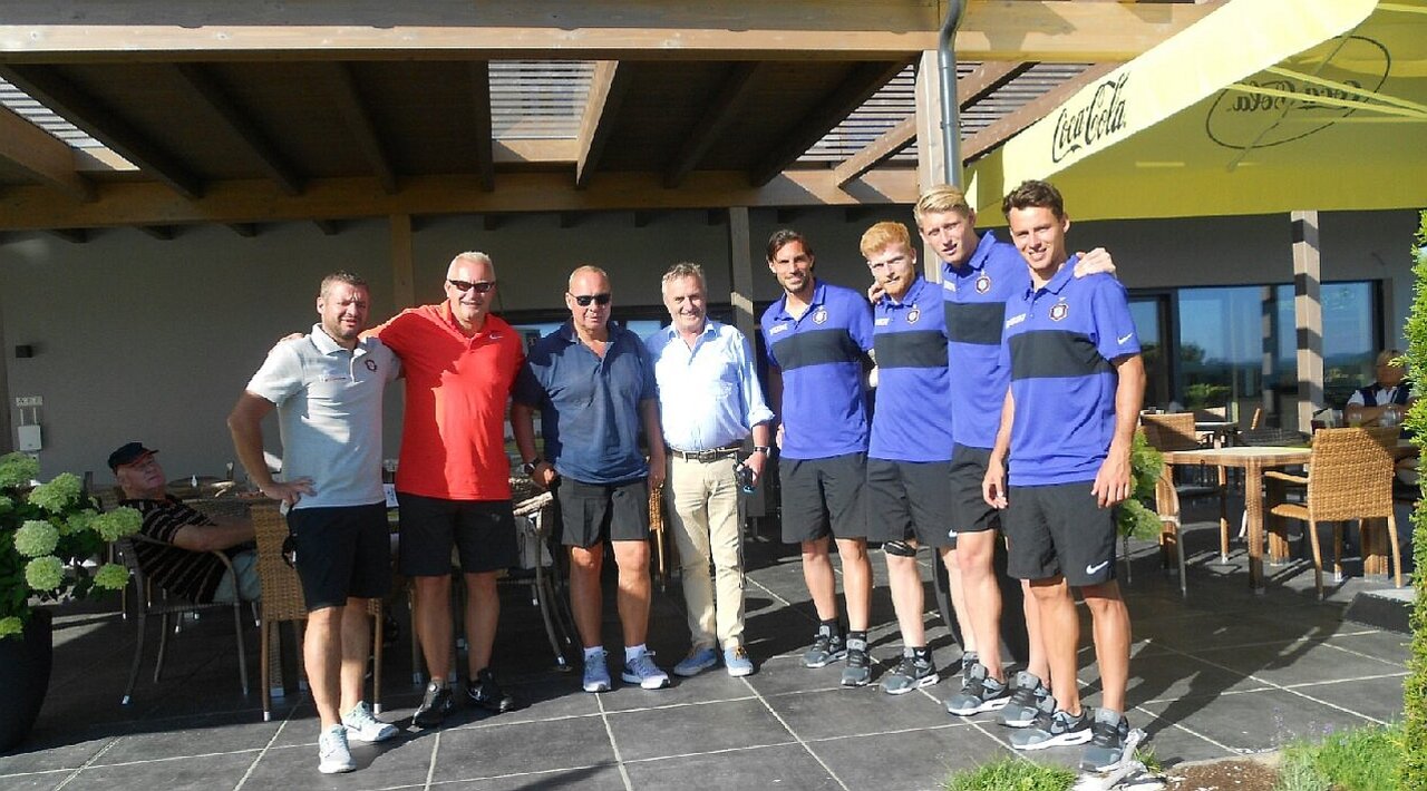 während des Trainingslagers in Oberösterreich auf Einladung von Manager Gerry Jekl (4. v. li.) ein paar Golfrunden am GC Donau, einen der attraktivsten Plätze Österreichs. Auch Daniel Haas, Fabian Kalig, Robert Jendrusch und Clemens Fandrich tauschten da kurzzeitig den großen gegen einen kleinen Ball.