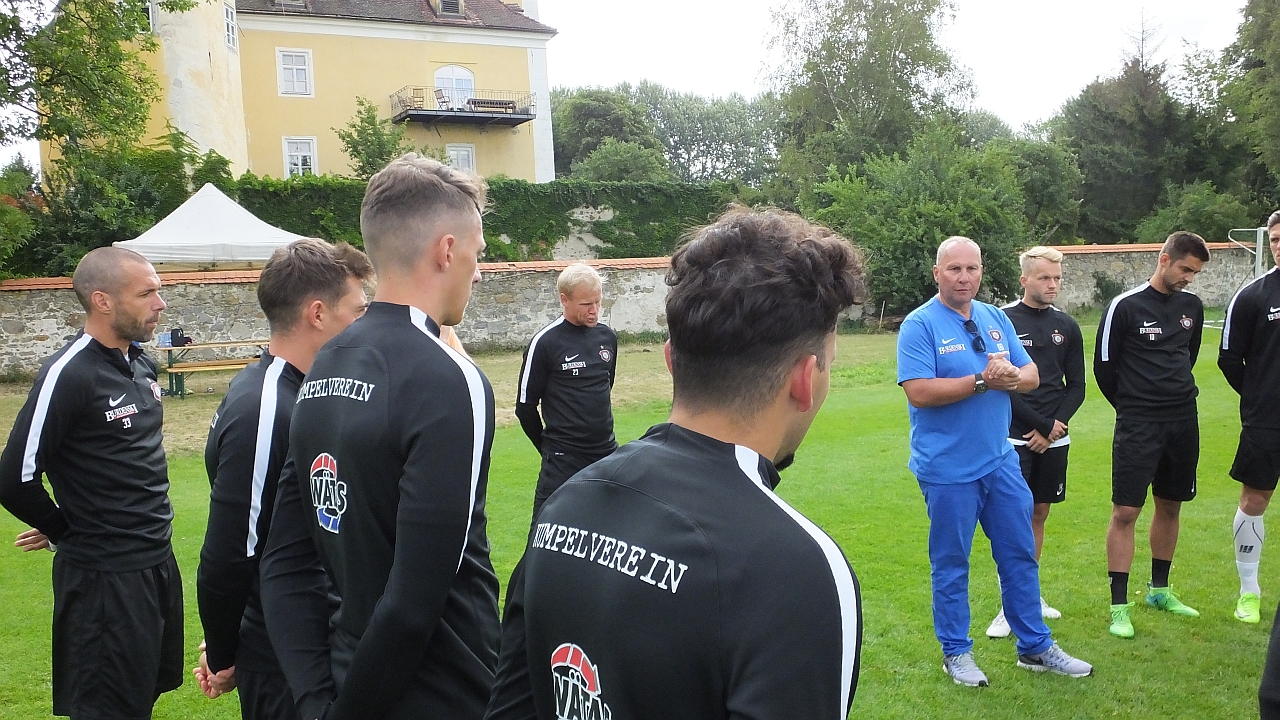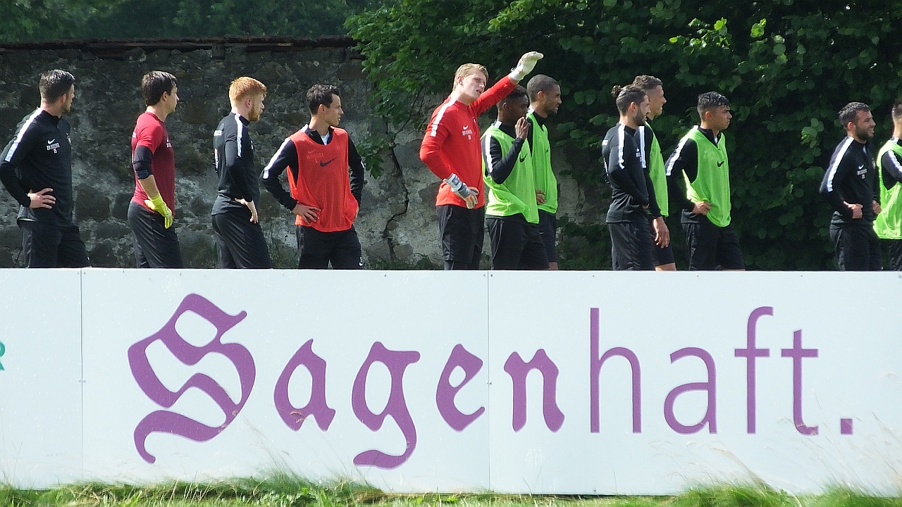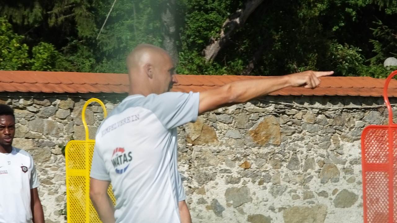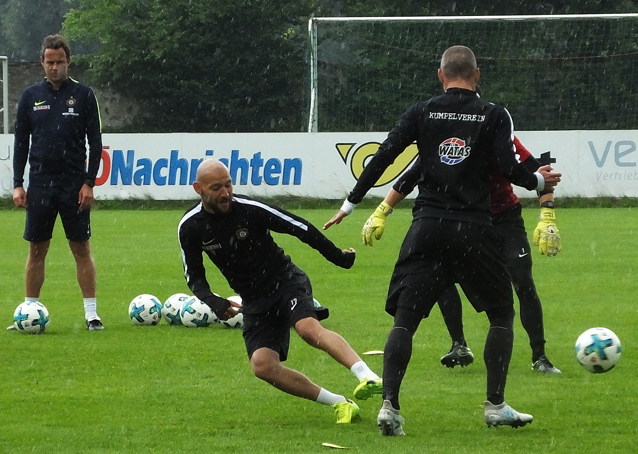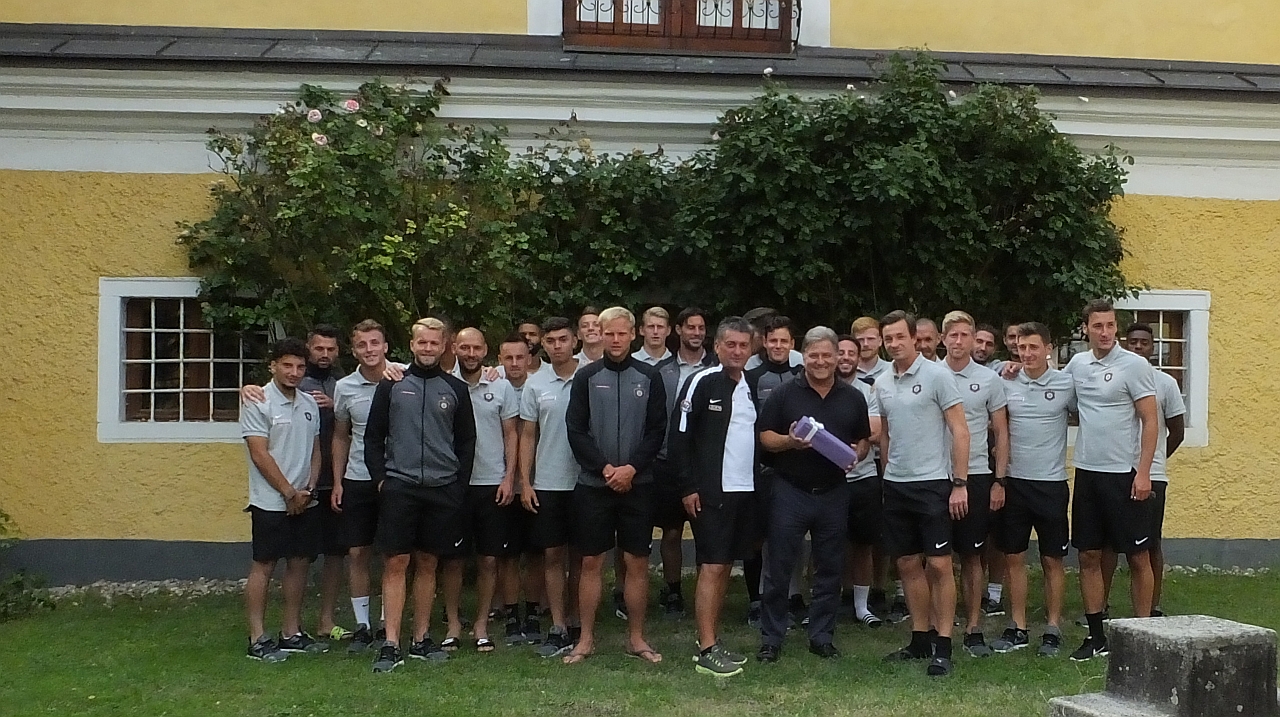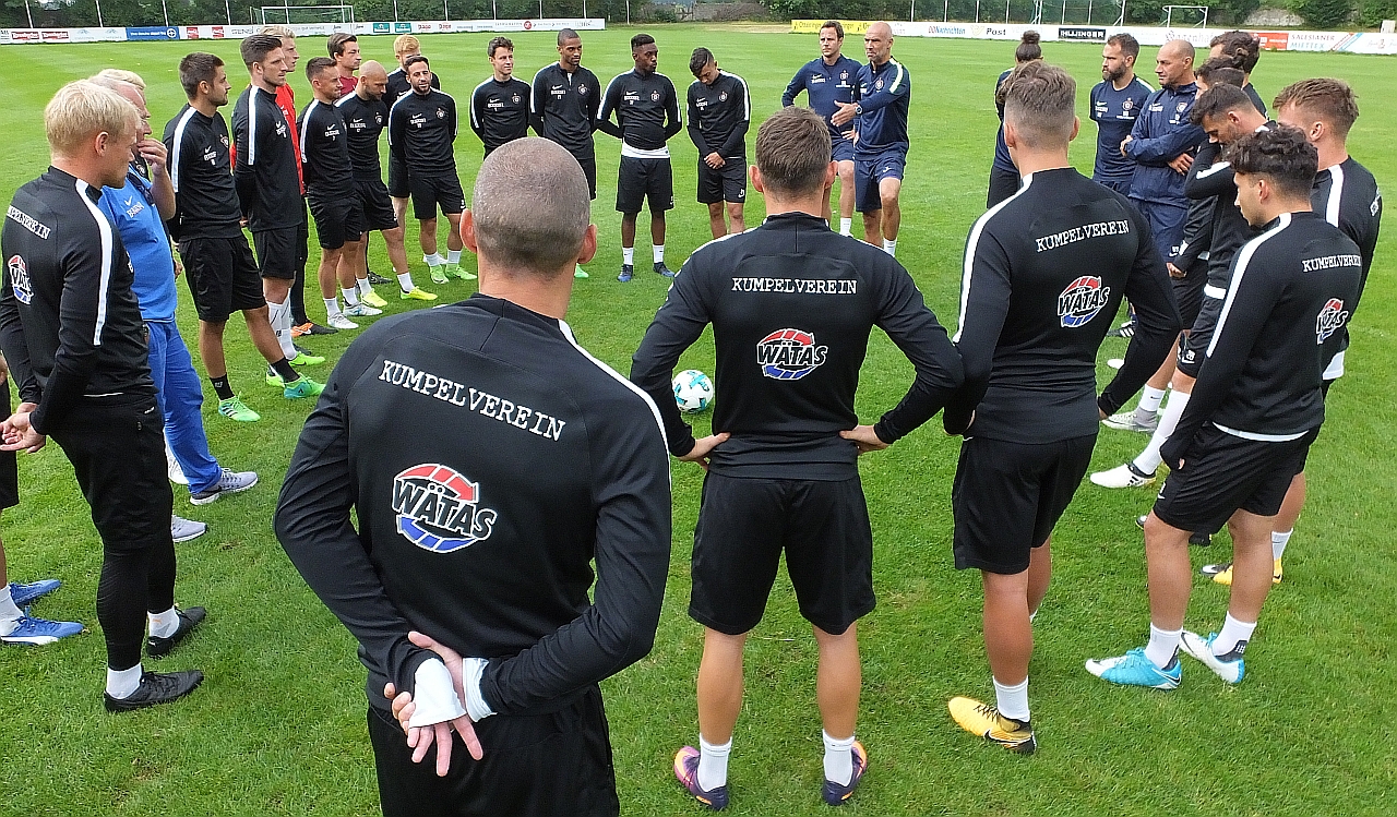 Vor Trainingsbeginn übergibt unser Chefcoach Thomas Letsch zunächst an Präsident Helge Leonhardt, der unserer Mannschaft für die bisherige Vorbereitung und den Fleiß hier im VeilchenCamp FELDKIRCHEN 2017 dankt.