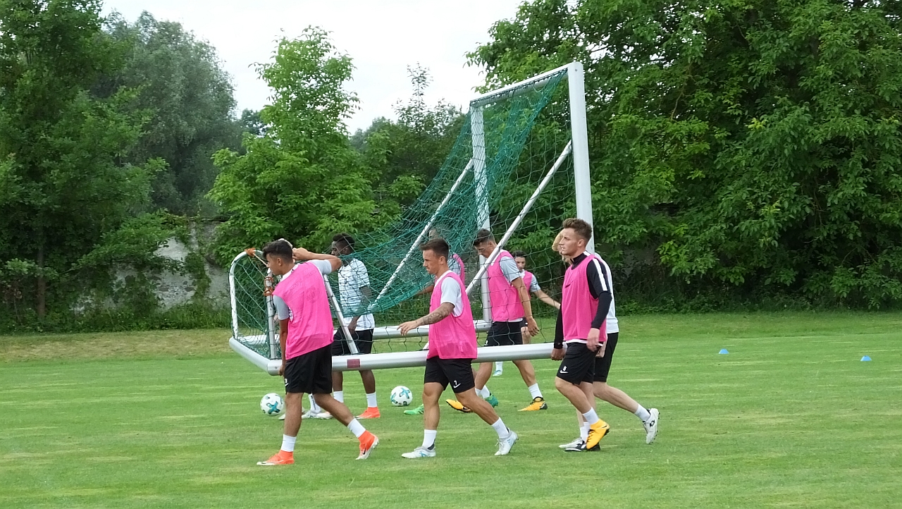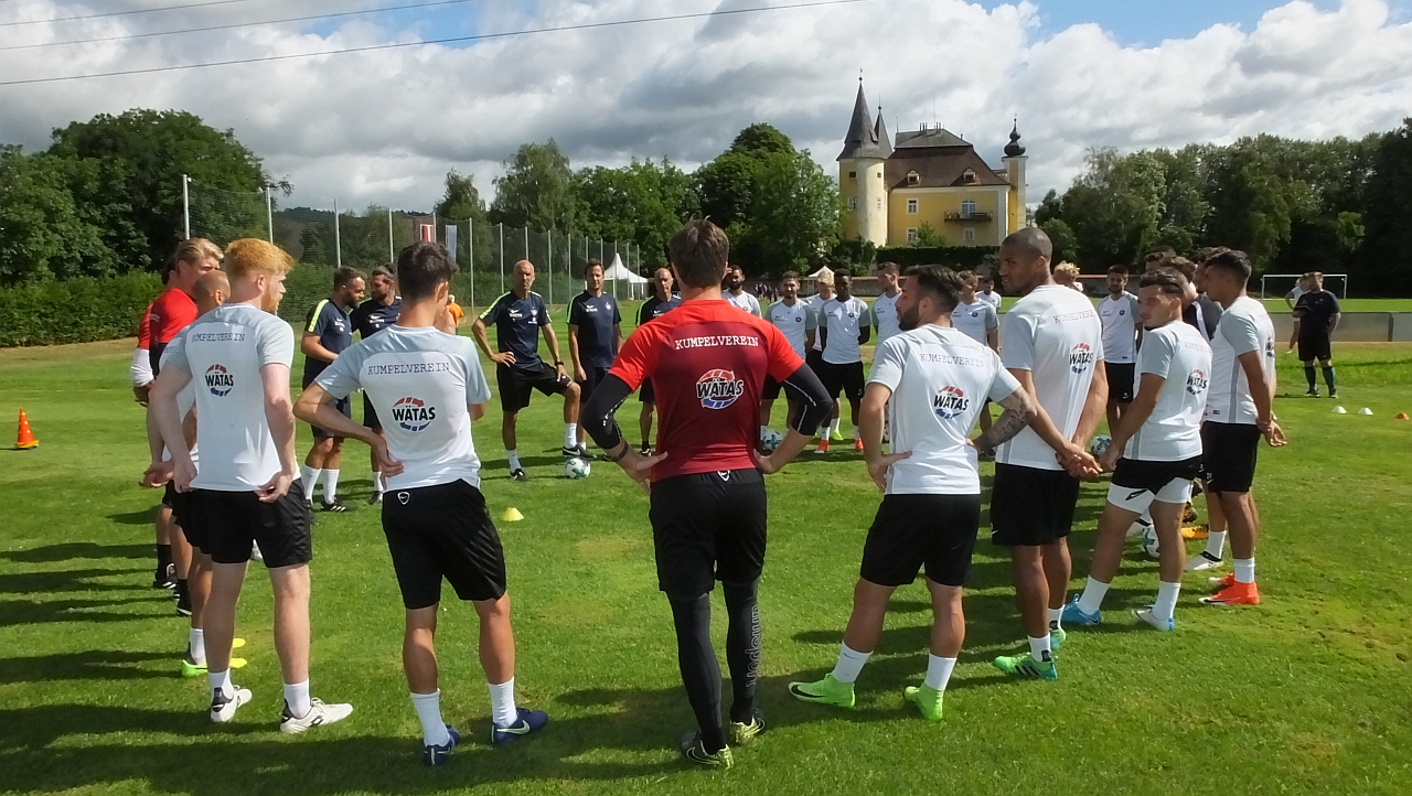 Aber natürlich hat im Camp das Training unserer Mannschaft oberste Priorität. Und hier erklärt unser Chefcoach Thomas Letsch die für den heutigen Tag geplanten Inhalte. Dabei stellt er den Veilchen auch einen Gastspieler aus Frankreich vor.