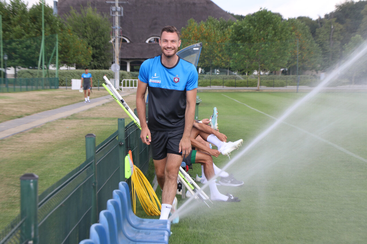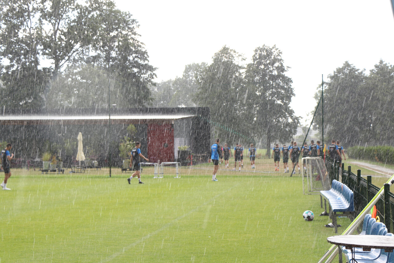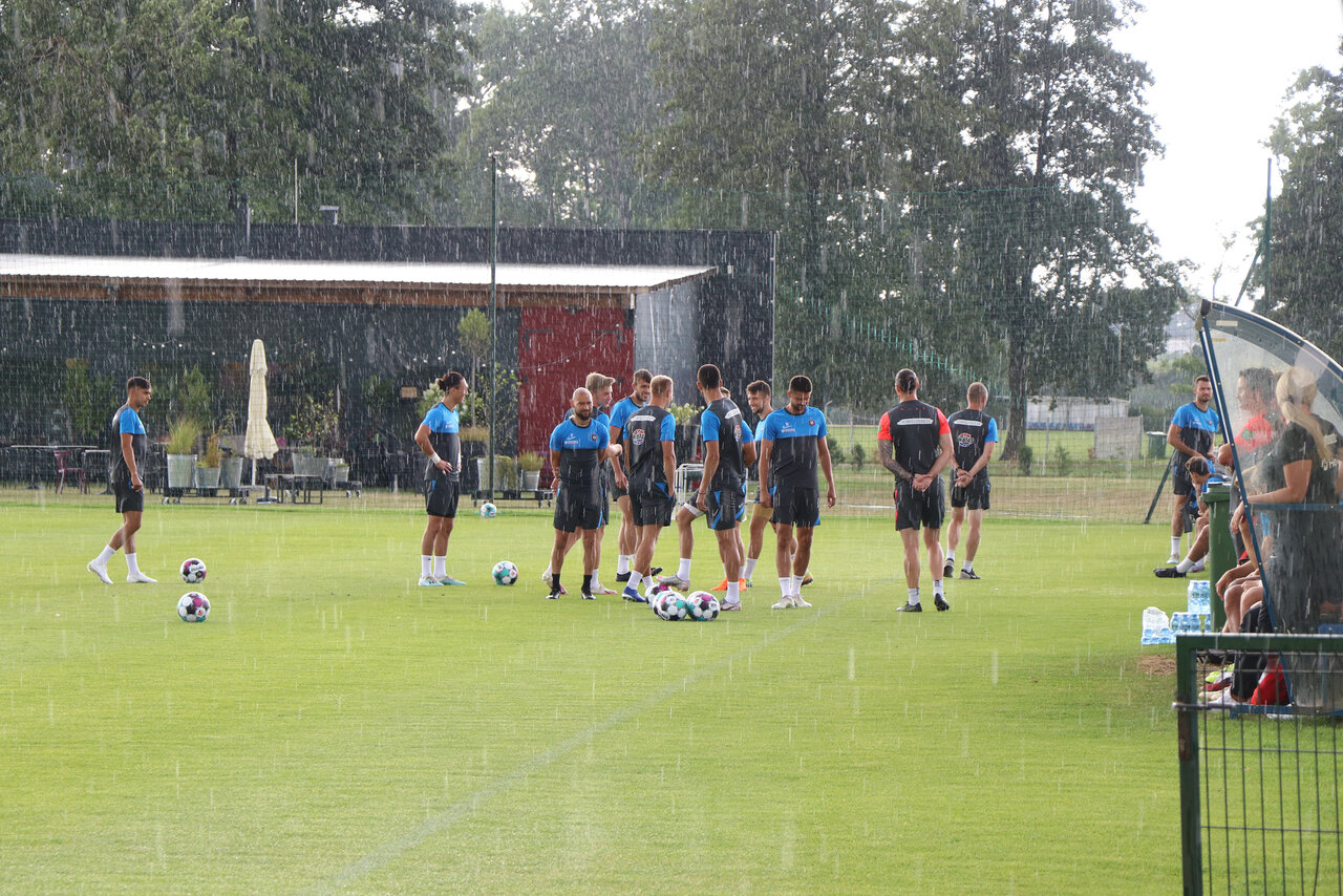 Das Vormittagstraining startete sehr erfrischend. Nachdem alle Spieler den Trainingsplatz betreten hatten gingen die Rasensprenger überraschend los. Den einen erwischte es ungewollt, der andere nahm die Erfrischung gerne an.