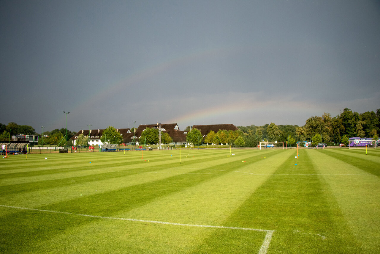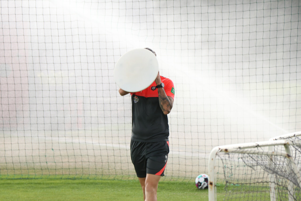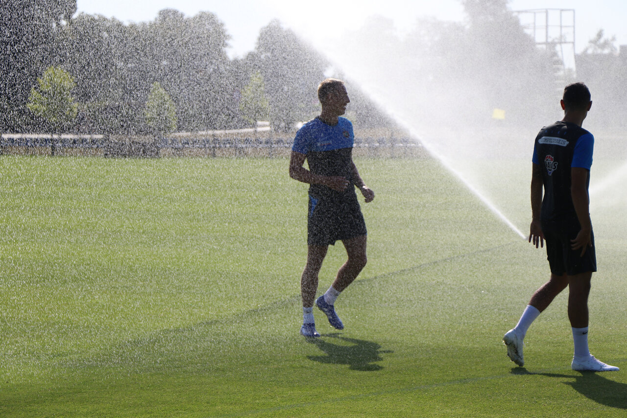 Das Vormittagstraining startete sehr erfrischend. Nachdem alle Spieler den Trainingsplatz betreten hatten gingen die Rasensprenger überraschend los. Den einen erwischte es ungewollt, der andere nahm die Erfrischung gerne an.