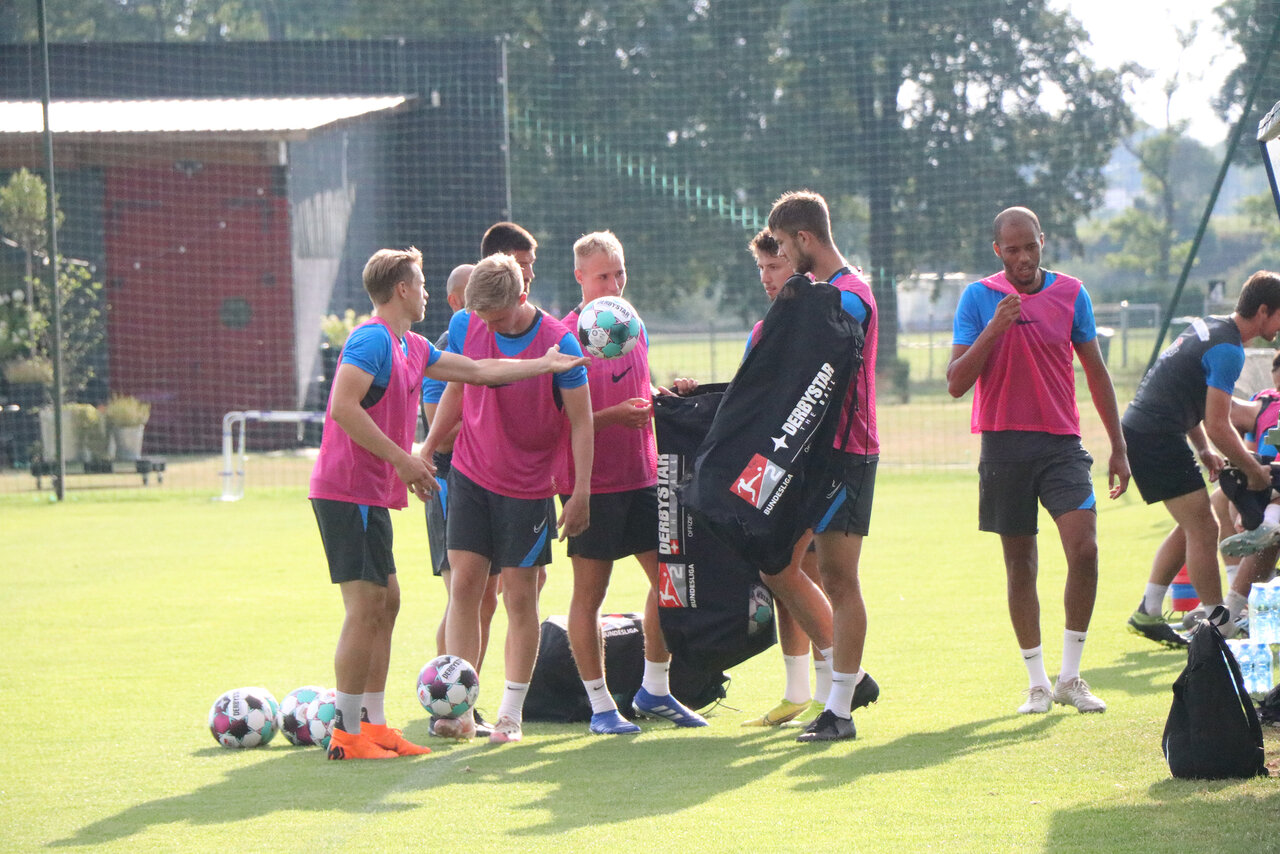 Dann bat Cheftrainer Dirk Schuster zum Training und erklärte den Spielern kurz den Ablauf. Nach kurzer Erwärmung und Aktivierung ging es zu dem aufgebauten "Hürdenballett". In verschiedenen Formen wurde dann sprichwörtlich durch die Hürden "getanzt".