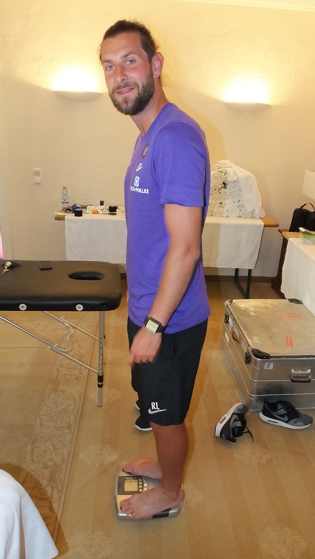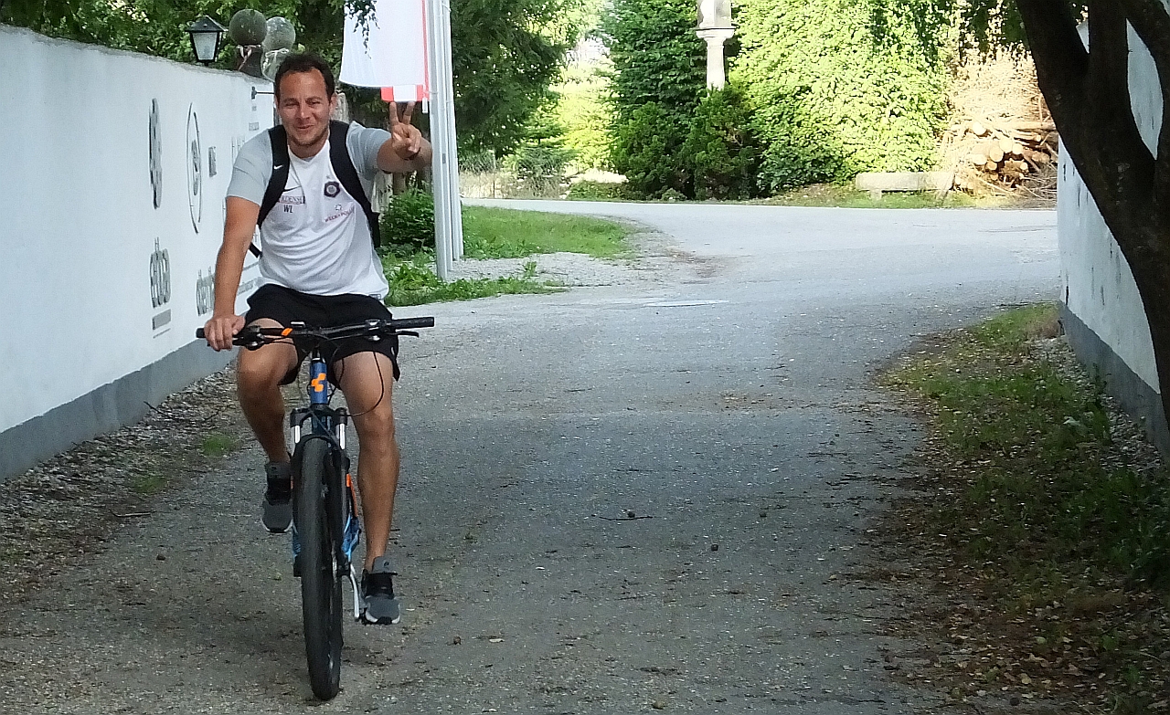 Der hölzerne Fußball gleich am Eingang zum Trainingsgelände verrät, dass hier schon etliche Mannschaften zu Gast waren - Hertha BSC ebenso wie 1899 Hoffeneim, Greuther Fürth oder auch der SSC Neapel. Dann 'erwischen' wir auch schon den bzw. die ersten Frühaufsteher. Co-Trainer Wolfgang Luisser kommt gerade von seiner Morgentour zurück.