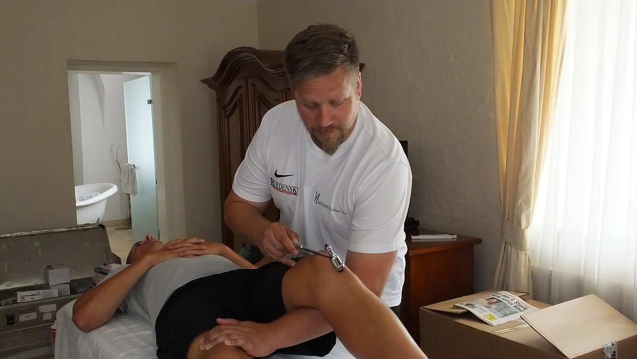 Teamarzt Torsten Friedrich erledigt hier im VeilchenCamp FELDKIRCHEN 2017 auch die vorgeschriebenen Medizinchecks, hier ist das speziell der orthopädische Teil der Untersuchungen.