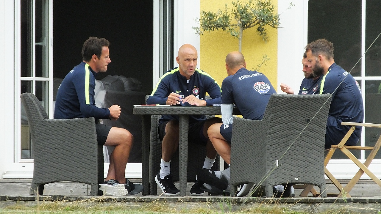 Mirnes Pepic und Mario Kvesic als Frühaufsteher beim Frühstück. Danach saß unser Trainerteam in kompletter Runde, feilte an den exkaten Trainingsinhalten für den Vormittag.