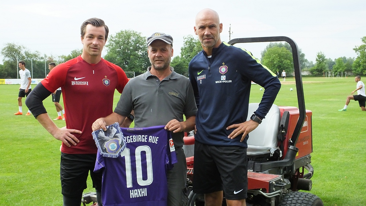 Zeit für ein Dankeschön der Veilchen an Greenkeeper HAXHI. Das überbringen Chefcoach Thomas Letsch und Kapitän Martin Männel. Dann wurde es aber höchste Zeit!
