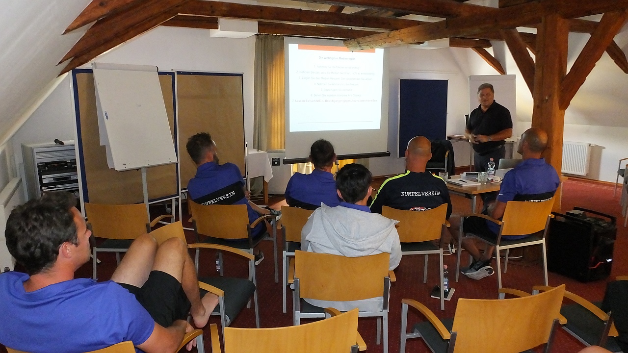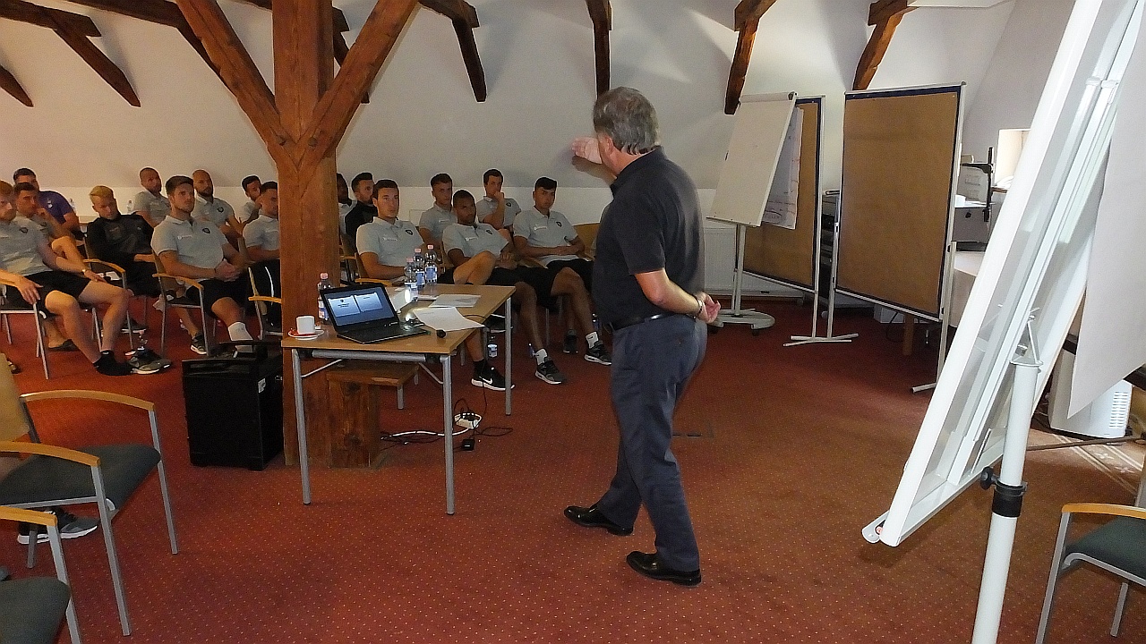 Zuerst sprach Hörwick vor dem Trainerteam, anschließend war die gesamte Mannschaft bei ihm versammelt. Alle hörten sehr gespannt und interessiert zu. Dabei ging es kreuz und quer durch die sehr spezielle Welt der Medienarbeit im Fußball.