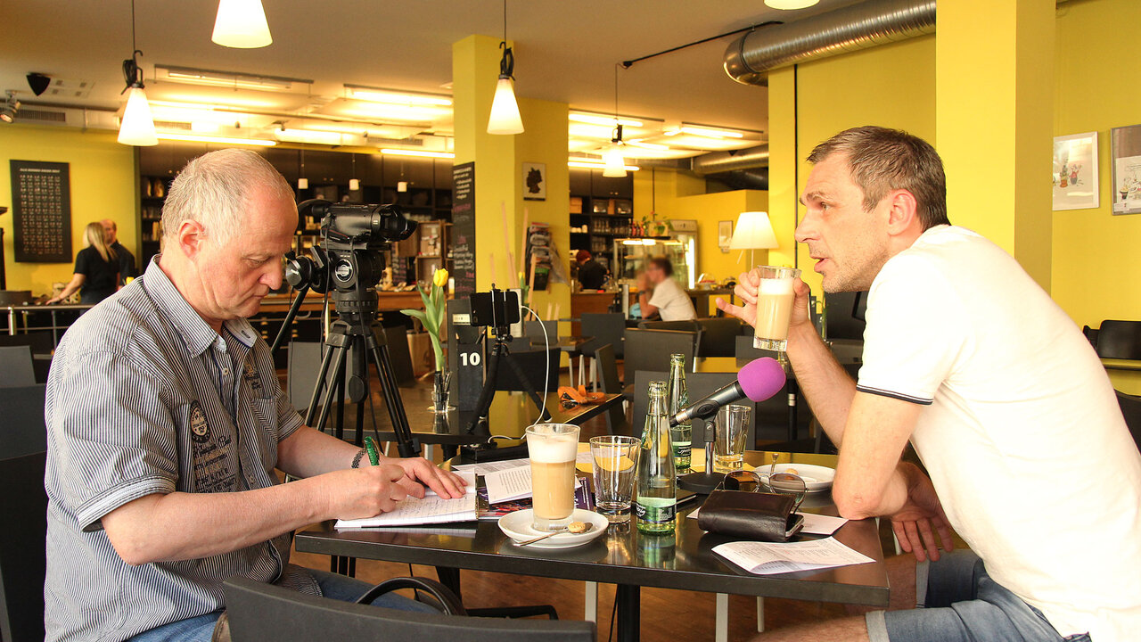 Samocca in Aue. Hier erzählte uns Tomasz wie er zum Fußball kam, dass er sich bei der ersten Fahrt nach Aue verfahren hat (damals gab es den Zubringer noch nicht) und wie sein Tagesablauf im Moment aussieht.