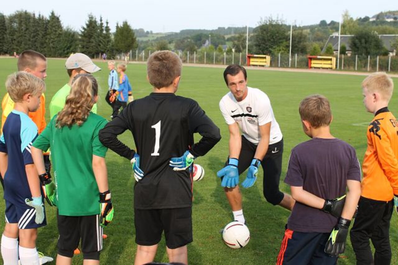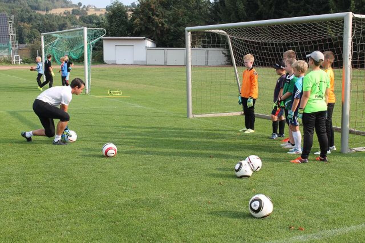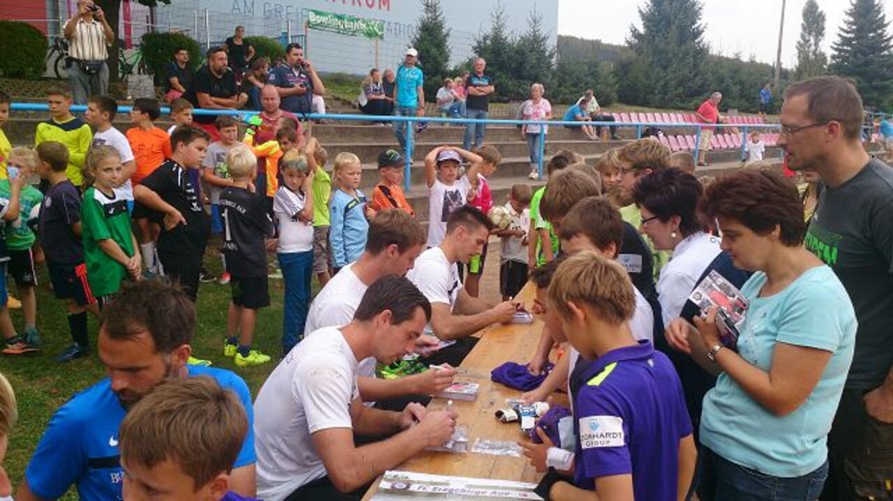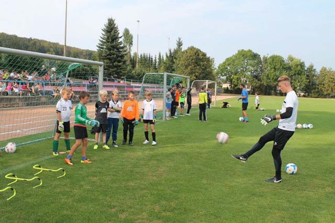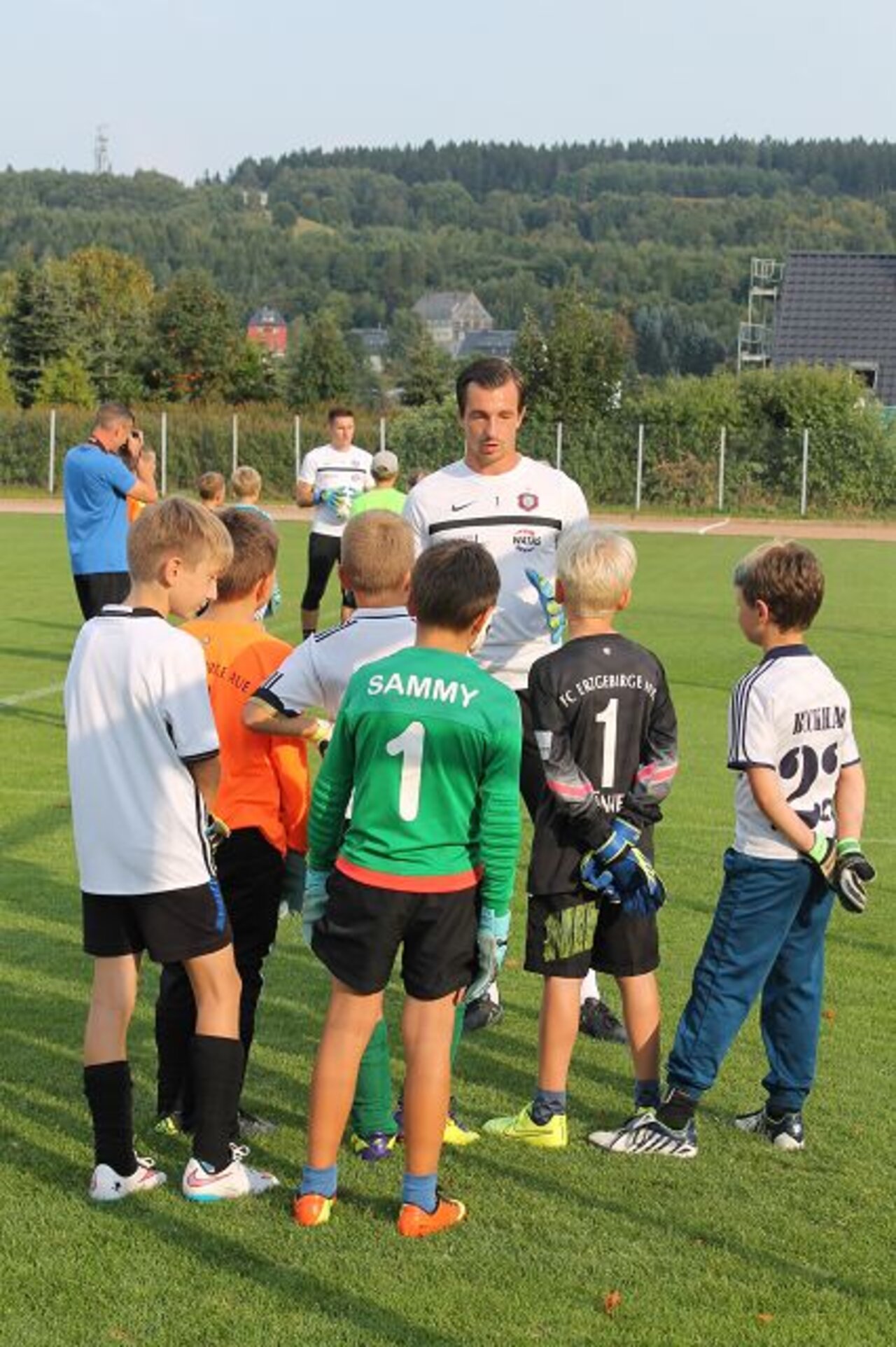 Martin Männel & Co. leiten Talentetraining in Ehrenfriedersdorf – Fanklub spendet 700 Euro an Deutsche Knochenmarkspende Ein Training mit Torwarttrainer Max Urwantschky und den vier Keepern der Zweitligamannschaft des FC Erzgebirge – dieser Traum erfüllte sich am Freitagnachmittag für 29 Nachwuchstorleute der Greifensteinregion. Spielort war das Greifensteinstadion in Ehrenfriedersdorf. Die Veilchen kamen am 1. September mit voller Kapelle; zusammen mit dem Proficoach leiteten Aues Nummer eins Martin Männel sowie die Torhüter Maik Ebersbach, Robert Jendrusch und Mario Seidel im Stationsbetrieb die Ausbildung. Bei bestem Fußballwetter hatten die E- und D-Junioren, darunter drei Mädchen, Spaß und Wissensgewinn. Mit von der Partie(y) waren Talente aus zwölf Vereinen der Bergstadt und ihrer Umgebung. Organisiert wurde das Training von den Veilchenfanklubs Jägerheim Geyer und Saubergkommando Ehrenfriedersdorf, am Grill und Zapfhahn sorgten die Jungs vom FC Greifenstein 04 dafür, dass die Zuschauer ein Fußballfest erlebten. „Torhüter wurden im Fußball lange unterschätzt, doch längst sind sie wichtige Leistungsträger, die nach vorn Impulse geben und, so wie Martin Männel als Kapitän in Aue, in vieler Hinsicht die Nummer eins sind”, nennt René Frenzel vom Saubergkommando das ursprüngliche Motiv der Initiatoren. Zufall, doch dass just an dem 1. September Bayern-Keeper Manuel Neuer von Bundestrainer „Jogi” Löw zum Kapitän des Nationalkaders berufen wurde, unterstreicht dies noch. „Jedenfalls wollen wir bei den Talenten unserer Vereine mit dem Profitraining das Gefühl stärken, eine ganz wichtige Rolle in ihren Teams zu spielen”, fügt FCE-Fan René hinzu. Zum Abschluss vereinbarten die Gäste aus Aue und die Fanklubs, künftig pro Jahr ein bis zwei weitere derartige Aktionen durchzuführen. Einen zusätzlichen positiven Akzent setzte das Saubergkommando an dem Nachmittag. Der Fanklub spendet den kompletten Jahresbeitrag, stolze 700 Euro, zugunsten der Deutschen Knochenmarkspende. Der Respekt von Urwantschky, Männel & Co. war den Sportfreunden damit sicher. (OS)