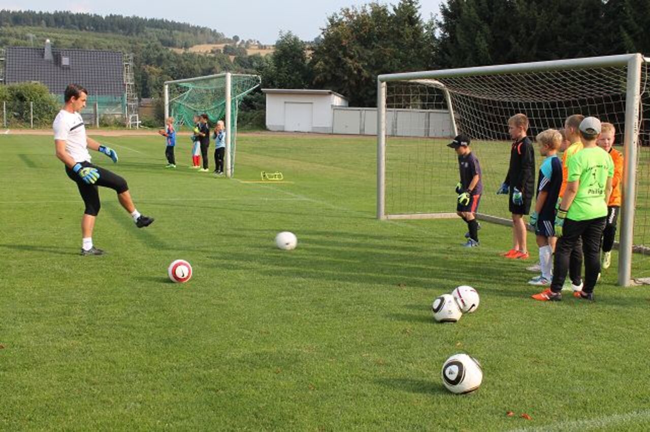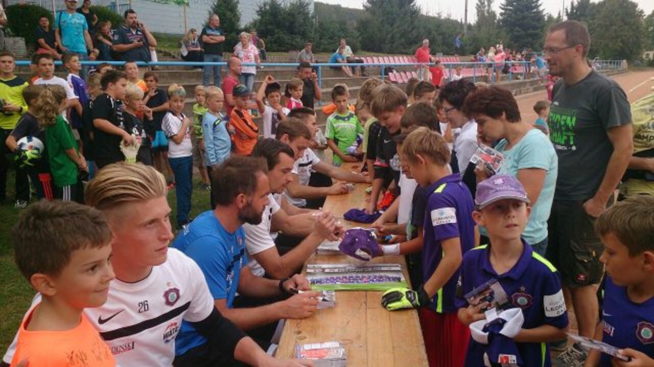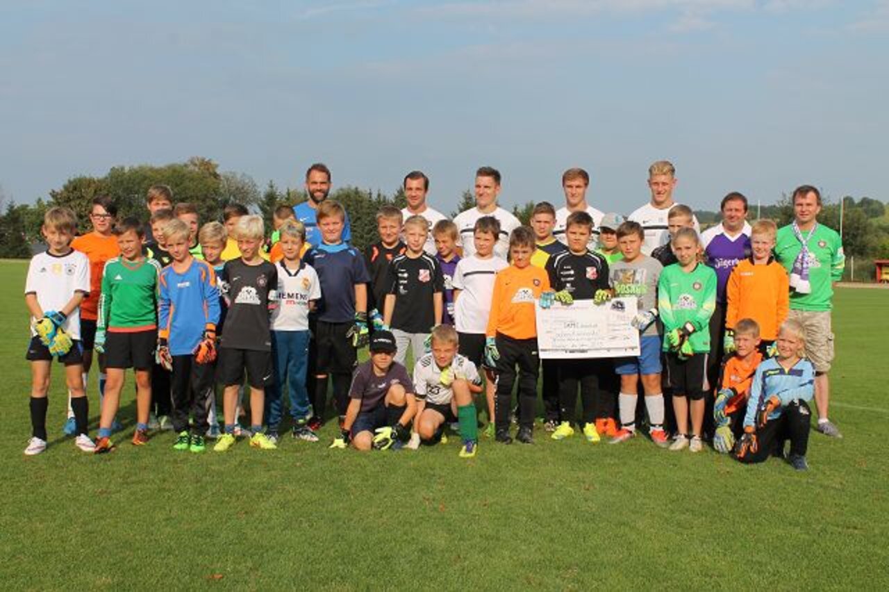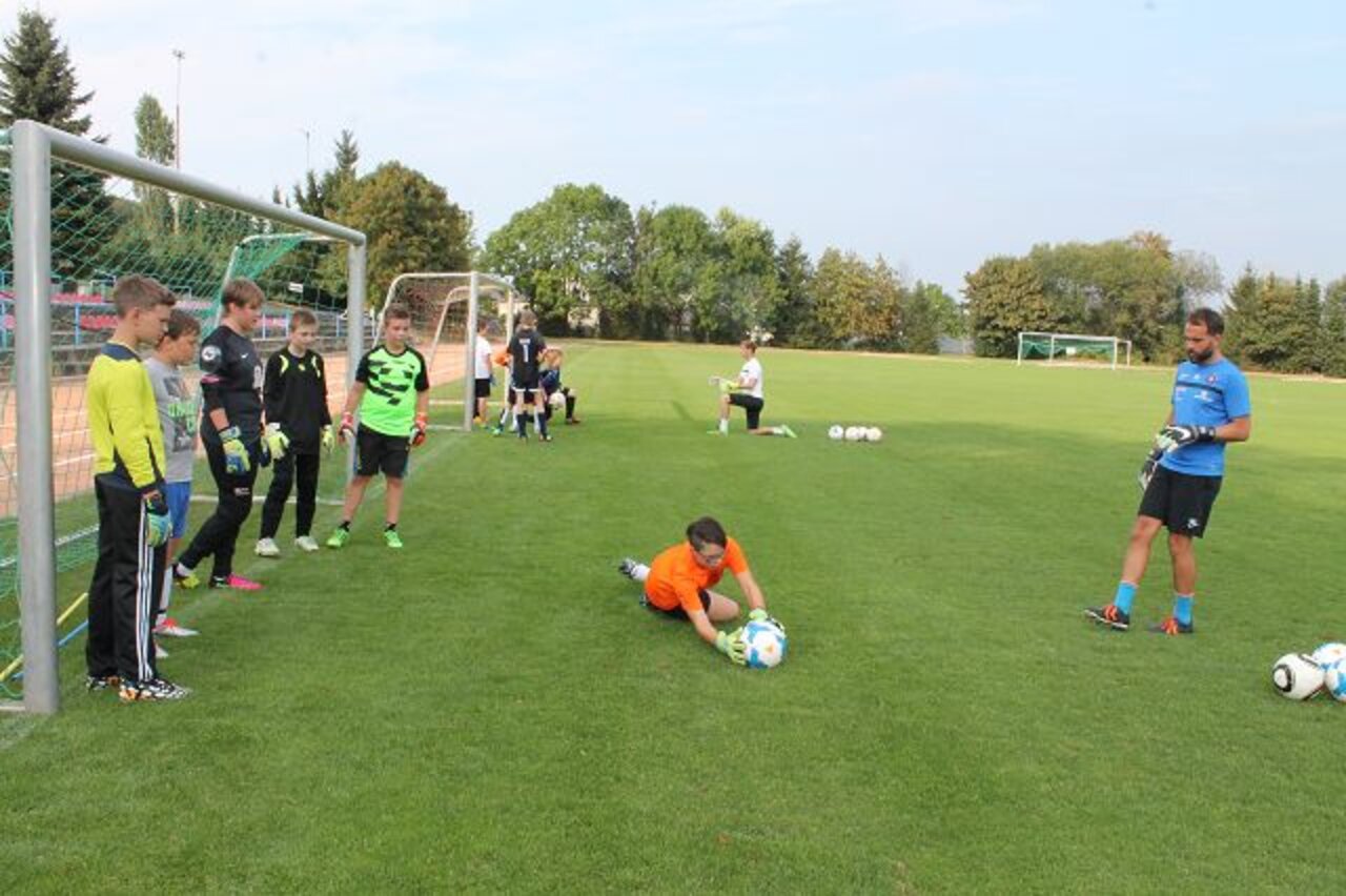 Martin Männel & Co. leiten Talentetraining in Ehrenfriedersdorf – Fanklub spendet 700 Euro an Deutsche Knochenmarkspende Ein Training mit Torwarttrainer Max Urwantschky und den vier Keepern der Zweitligamannschaft des FC Erzgebirge – dieser Traum erfüllte sich am Freitagnachmittag für 29 Nachwuchstorleute der Greifensteinregion. Spielort war das Greifensteinstadion in Ehrenfriedersdorf. Die Veilchen kamen am 1. September mit voller Kapelle; zusammen mit dem Proficoach leiteten Aues Nummer eins Martin Männel sowie die Torhüter Maik Ebersbach, Robert Jendrusch und Mario Seidel im Stationsbetrieb die Ausbildung. Bei bestem Fußballwetter hatten die E- und D-Junioren, darunter drei Mädchen, Spaß und Wissensgewinn. Mit von der Partie(y) waren Talente aus zwölf Vereinen der Bergstadt und ihrer Umgebung. Organisiert wurde das Training von den Veilchenfanklubs Jägerheim Geyer und Saubergkommando Ehrenfriedersdorf, am Grill und Zapfhahn sorgten die Jungs vom FC Greifenstein 04 dafür, dass die Zuschauer ein Fußballfest erlebten. „Torhüter wurden im Fußball lange unterschätzt, doch längst sind sie wichtige Leistungsträger, die nach vorn Impulse geben und, so wie Martin Männel als Kapitän in Aue, in vieler Hinsicht die Nummer eins sind”, nennt René Frenzel vom Saubergkommando das ursprüngliche Motiv der Initiatoren. Zufall, doch dass just an dem 1. September Bayern-Keeper Manuel Neuer von Bundestrainer „Jogi” Löw zum Kapitän des Nationalkaders berufen wurde, unterstreicht dies noch. „Jedenfalls wollen wir bei den Talenten unserer Vereine mit dem Profitraining das Gefühl stärken, eine ganz wichtige Rolle in ihren Teams zu spielen”, fügt FCE-Fan René hinzu. Zum Abschluss vereinbarten die Gäste aus Aue und die Fanklubs, künftig pro Jahr ein bis zwei weitere derartige Aktionen durchzuführen. Einen zusätzlichen positiven Akzent setzte das Saubergkommando an dem Nachmittag. Der Fanklub spendet den kompletten Jahresbeitrag, stolze 700 Euro, zugunsten der Deutschen Knochenmarkspende. Der Respekt von Urwantschky, Männel & Co. war den Sportfreunden damit sicher. (OS)