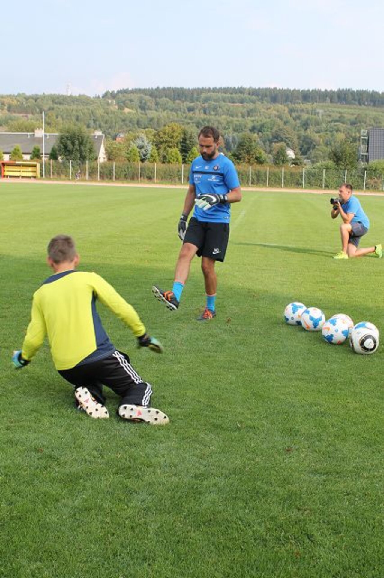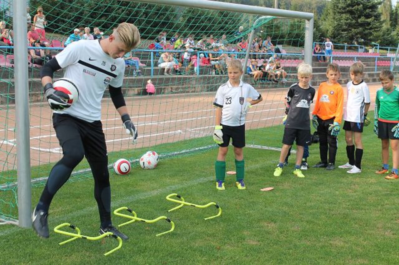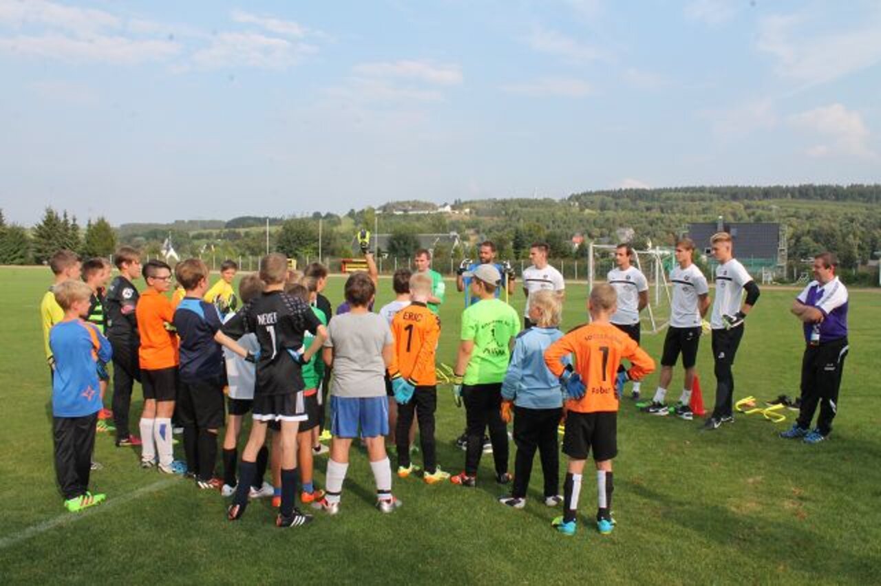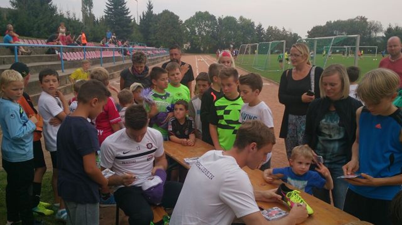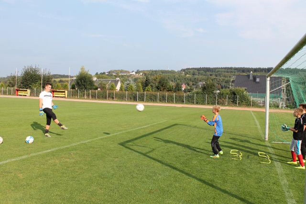 Martin Männel & Co. leiten Talentetraining in Ehrenfriedersdorf – Fanklub spendet 700 Euro an Deutsche Knochenmarkspende Ein Training mit Torwarttrainer Max Urwantschky und den vier Keepern der Zweitligamannschaft des FC Erzgebirge – dieser Traum erfüllte sich am Freitagnachmittag für 29 Nachwuchstorleute der Greifensteinregion. Spielort war das Greifensteinstadion in Ehrenfriedersdorf. Die Veilchen kamen am 1. September mit voller Kapelle; zusammen mit dem Proficoach leiteten Aues Nummer eins Martin Männel sowie die Torhüter Maik Ebersbach, Robert Jendrusch und Mario Seidel im Stationsbetrieb die Ausbildung. Bei bestem Fußballwetter hatten die E- und D-Junioren, darunter drei Mädchen, Spaß und Wissensgewinn. Mit von der Partie(y) waren Talente aus zwölf Vereinen der Bergstadt und ihrer Umgebung. Organisiert wurde das Training von den Veilchenfanklubs Jägerheim Geyer und Saubergkommando Ehrenfriedersdorf, am Grill und Zapfhahn sorgten die Jungs vom FC Greifenstein 04 dafür, dass die Zuschauer ein Fußballfest erlebten. „Torhüter wurden im Fußball lange unterschätzt, doch längst sind sie wichtige Leistungsträger, die nach vorn Impulse geben und, so wie Martin Männel als Kapitän in Aue, in vieler Hinsicht die Nummer eins sind”, nennt René Frenzel vom Saubergkommando das ursprüngliche Motiv der Initiatoren. Zufall, doch dass just an dem 1. September Bayern-Keeper Manuel Neuer von Bundestrainer „Jogi” Löw zum Kapitän des Nationalkaders berufen wurde, unterstreicht dies noch. „Jedenfalls wollen wir bei den Talenten unserer Vereine mit dem Profitraining das Gefühl stärken, eine ganz wichtige Rolle in ihren Teams zu spielen”, fügt FCE-Fan René hinzu. Zum Abschluss vereinbarten die Gäste aus Aue und die Fanklubs, künftig pro Jahr ein bis zwei weitere derartige Aktionen durchzuführen. Einen zusätzlichen positiven Akzent setzte das Saubergkommando an dem Nachmittag. Der Fanklub spendet den kompletten Jahresbeitrag, stolze 700 Euro, zugunsten der Deutschen Knochenmarkspende. Der Respekt von Urwantschky, Männel & Co. war den Sportfreunden damit sicher. (OS)