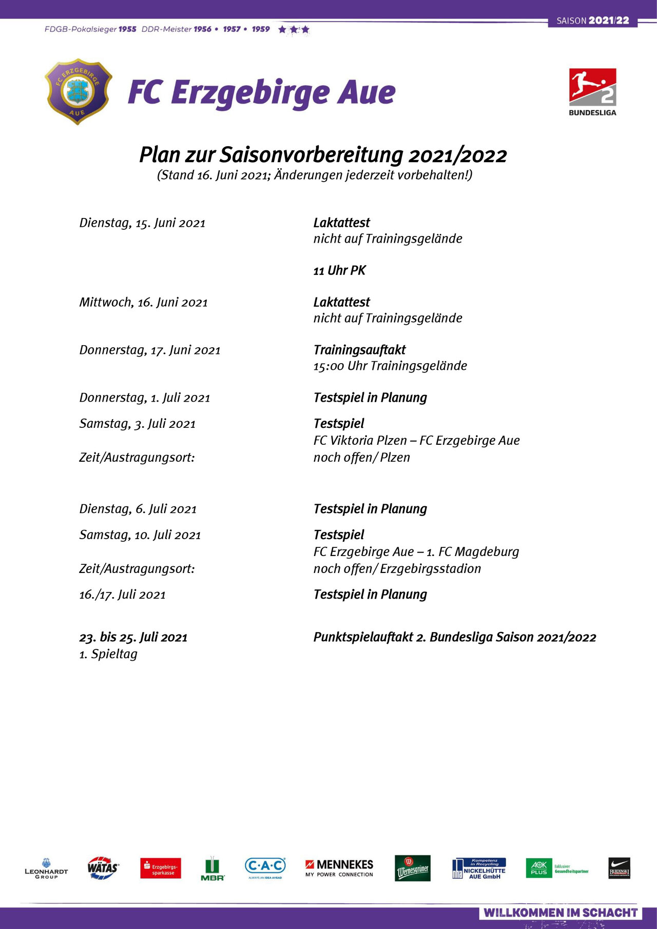 Bisher wurden zwei Testspiele vereinbart. Am 3. Juli spielen wir beim FC Viktoria Plzen und am 10. Juli empfängt der FCE im Erzgebirgstadion den 1. FC Magdeburg. Für beide Spiele gibt es noch keine genaue Anstoßzeiten.