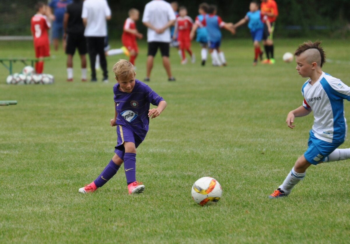 Am Schulanfangssamstag ging es für unsere jungen Veilchen auf die Westkampfbahn der Fortuna aus Chemnitz. Bei besten Fußball Wetter, stand ein erster Leistungsvergleich dieser noch jungen Saison für uns an. Neben dem Gastgeber VFB Fortuna Chemnitz, waren weitere 12 top Teams am Start. Allesamt trugen zu einem Turnier auf sehr gutem Niveau bei. Neben den Zahlreichen nationalen Teams, waren auch zwei Mannschaften aus Polen dabei. Ungeschlagen, mit 18 Punkten und 17:0 Toren, erspielte sich unser Team gegen den FC Rot-Weiß Erfurt (2:0), TSV IFA Chemnitz (5:0), RB Leipzig (1:0), VTB Chemnitz (6:0) und unseren Polnischen Freunden vom KS Arkonia Szczecin II (1:0) in der Vorrunde der Gruppe B, einen souveränen 1. Platz. Da ein Team ausgefallen ist, wurde für alle Mannschaften diese Partie mit 2.0 gewertet. Im Viertelfinale traf man dann auf das Team vom Halleschen FC. Gegen einen Gegner der geschlossen mit sechs Mann sehr hoch in der Gegnerischen Hälfte agierte, mussten sich unsere Jungs immer wieder den dadurch entstehenden Druck erwehren und in vielen 1 gegen 1 Situationen durchsetzen. Am Ende gelang uns den entscheidenden Treffer zu erzielen und zogen so mit einem 1:0 Sieg in das Halbfinale ein. Mit dem FC Rot-Weiß Erfurt, erwartete uns kein unbekannter Gegner. In einem sehr umkämpften, mit hohen Tempo geführten Spiel, konnten wir unsere angriffen nicht mehr mit der letzten Konsequenz nach vorne tragen. So hieß es nach der regulären Spielzeit 0:0 und das 9 Meter schießen musste her. Hier unterlagen wir am Schluss mit 2:3. Enttäuscht und mit einer ordentlichen Portion Wut im Bauch, mussten unser Jungs direkt, ohne Pause, im Spiel um Platz 3 gegen den 1. FC Lok Leipzig ran. Hier gilt unser allerhöchster Respekt! Unbeirrt der so schmerzlichen Niederlage im 9 Meter Schießen, zeigte das Team nochmal wozu sie in der Lage ist! Lauffreudig, mutig und kombinationssicher, erspielten sich unsere lilaweisen Veilchen einen 3:0 Sieg und erspielten sich so einem starken 3. Platz. Beim Veranstalter und dem VFB Fortuna Chemnitz bedanken wir uns für ein toll organisiertes Turnier und wünschen euch viel Erfolg in der neuen Saison! Glück auf