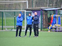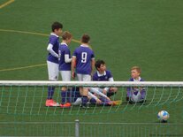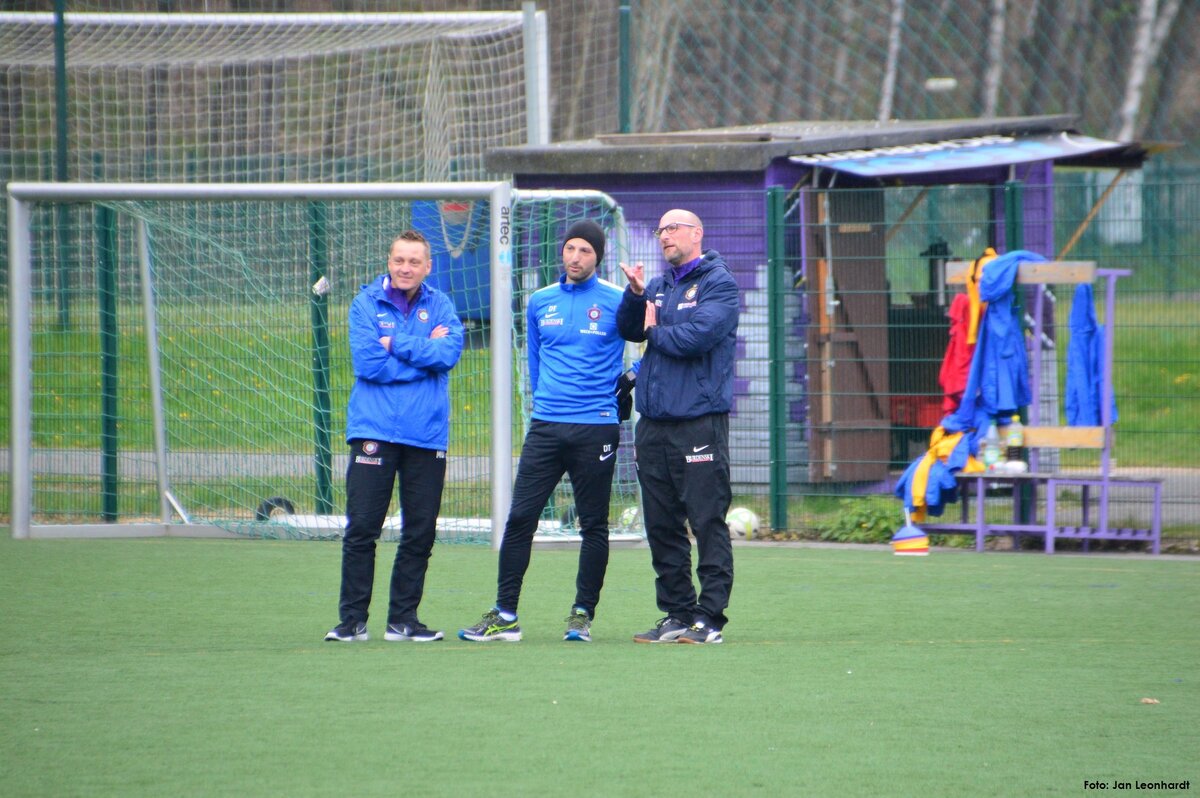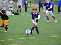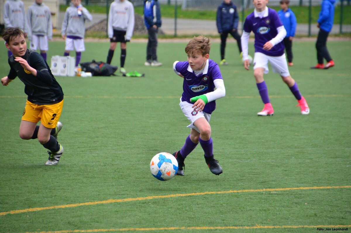 Nach zwei Testspielen unter der Woche hatten unsere 2005er am Samstag die U13 des VfB Auerbach zu Gast. Und erneut konnten unsere Jungs und Kyra trotz einer richtig guten Leistung nichts Zählbares aus dieser Partie mitnehmen. Unser Team war von Beginn an griffig und kombinierte sich unter den Augen eines von dieser Spielweise begeisterten Profi-Cheftrainers Domenico Tedesco zu einer Torchance nach der anderen. Leider ging es trotz vieler guter Möglichkeiten nur mit einem 0:0 in die Halbzeit, aus der die jungen Veilchen dann aber sofort wieder top motiviert herauskamen. Und folgerichtig gingen sie dann kurz nach Wiederanpfiff auch in Führung. Nach einem Standard setzte Paul Börner energisch nach und drückte die Kugel über die Linie des von einem ganz stark agierenden Keeper gehüteten Auerbacher Tores. Leider versäumte es unsere U12 trotz Überlegenheit und wesentlich mehr Spielanteilen dann das zweite oder gar dritte Tor nachzulegen und so kam es, wie es im Fußball häufig kommt. Nachdem unsere beiden an diesem Tag extrem fleißigen Angreifer Fabio Westerhof und Lennart Kröber kurz vor Schluss durch frische Offensivkräfte ersetzt werden sollten, ging plötzlich und vollkommen unverständlich leider auch der Spielfluss und die Griffigkeit verloren. Auerbach setzte nun alles auf eine Karte und schnürte unser Team in der eigenen Hälfte ein, das jetzt nicht mehr zu entlastenden Angriffsaktionen kam. Binnen zwei Minuten drehten sie mit einer ganz starken Willensleistung die Partie und als die jungen Veilchen dann ebenfalls öffneten, legten sie in der Schlussminute sogar noch einen Treffer zum 1:3 Endstand nach. Danach zeigte der sehr gute Schiedsrichter Kai Sadowski in der Nachspielzeit nach einem klaren Foulspiel an Chris Giesel noch auf den Neunmeterpunkt. Dass dieser Strafstoß dann von Tommy Stopp auch noch vergeben wurde, passt zwar zu dieser ernüchternden Schlussphase in diesem Spiel, viel aber ohnehin nicht mehr ins Gewicht. Nun gilt es am kommenden Wochenende gegen Wacker Plauen wieder zu einem Erfolgserlebnis zu kommen, um den Anschluss an das obere Mittelfeld der Tabelle nicht zu verlieren. Gegen Auerbach spielten: Kyra Spitzner (TW), Paul Börner (1), Samuel Urlaß, Noah Lenk, Tommy Stopp, Toni Wagenknecht, Lennart Kröber, Fabio Westerhof, Paul Schneider, Chris Giesel und Nico Weber (ETW) Foto 1: Samuel Urlaß machte ein starkes Spiel und gewann viele solcher verbissenen Zweikämpfe Foto 2: Fabio Westerhof zeigte sehr viel Dynamik und stets einen offenen Blick für den Mitspieler Foto 3: Profi-Cheftrainer Domenico Tedesco im Fachgespräch mit U12-Cheftrainer Jörg Lenk Foto 4: Sichtbare Enttäuschung bei den 2005ern nach einer ganz bitteren Niederlage