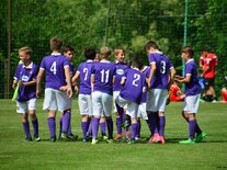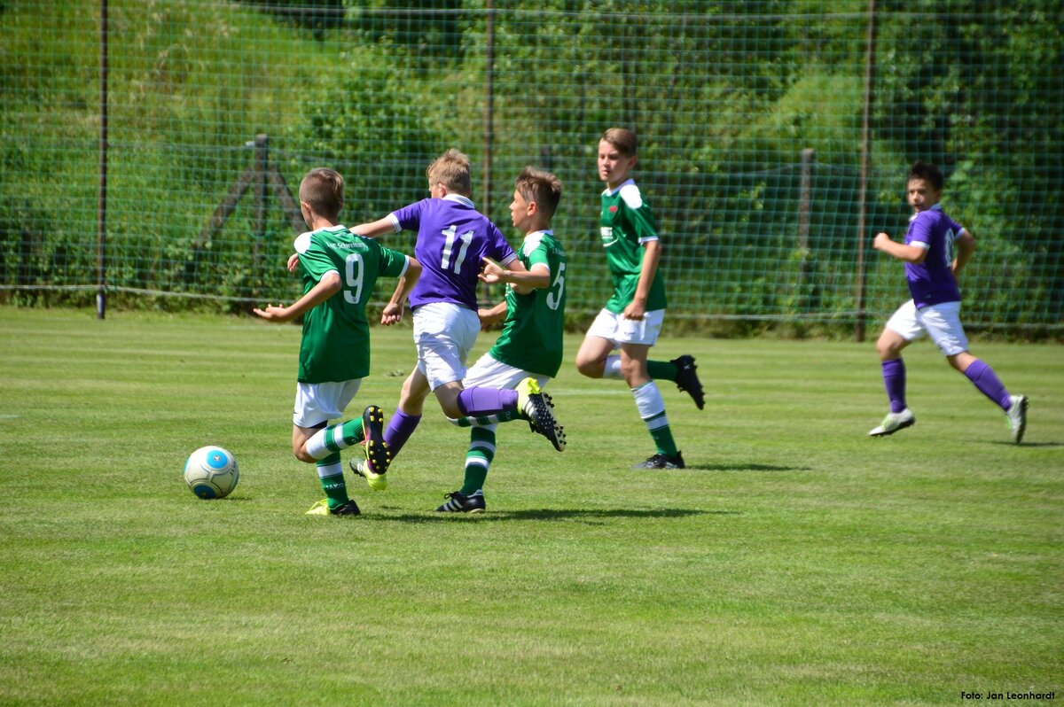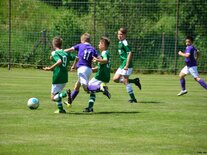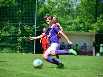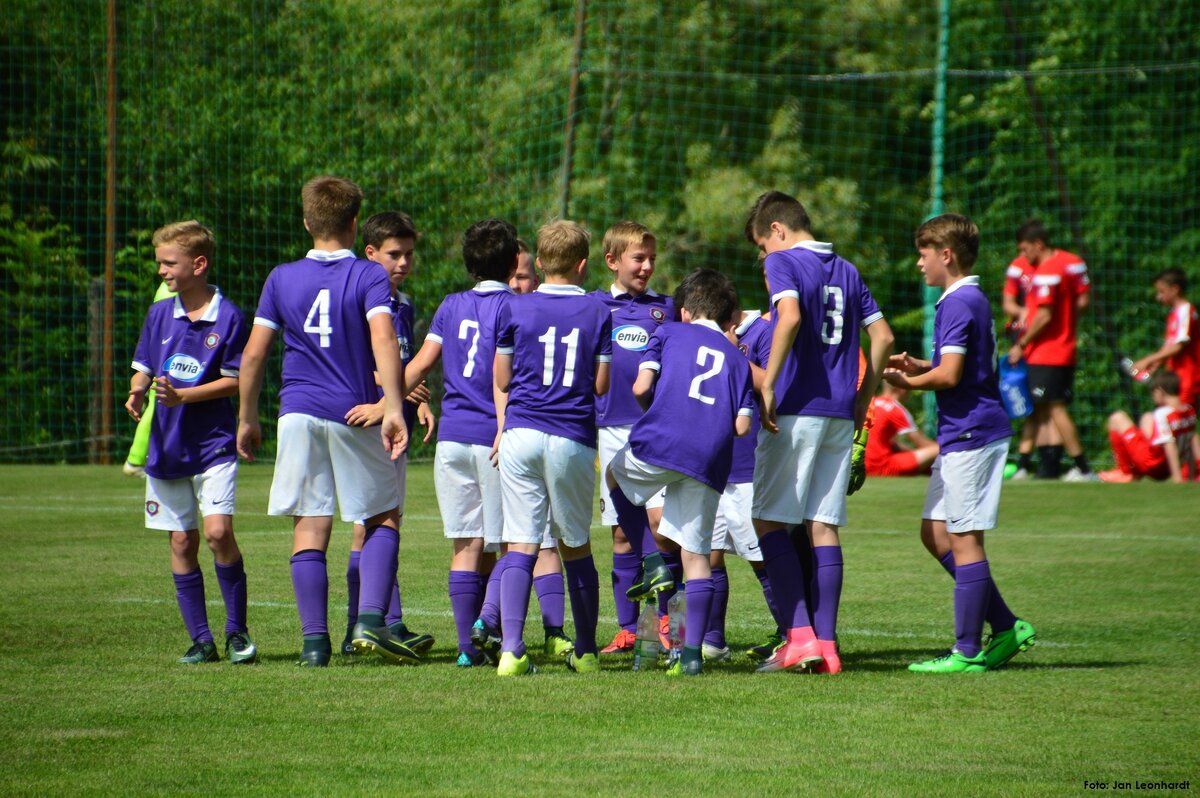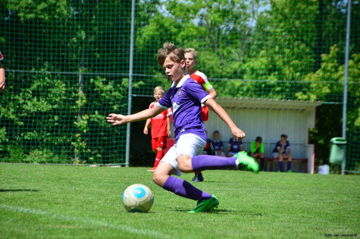 Am Samstag waren unsere 2005er zu einem mit insgesamt acht Leistungszentren richtig stark besetzten Leistungsvergleich beim FC Rot-Weiß Erfurt eingeladen, lieferten hier einen sehr guten Auftritt ab und setzten damit die positive Entwicklung der letzten Wochen fort. Vorab ein ganz großes Dankeschön an die Nachwuchsverantwortlichen der Rot-Weißen für die Organisation eines tollen Turniers unter besten Platz- und äußeren Rahmenbedingungen. Im ersten Spiel traf unsere U12 auf den 1. FC Magdeburg. Das Team benötigte einige Zeit, um sich an das größere Spielfeld (Großfeld von Strafraum zu Strafraum) und die Abseitsregel zu gewöhnen, ließ aber in einem sehr ausgeglichenen Spiel hinten nichts anbrennen und trennte sich von einem robusten Gegner mit einem torlosen Unentschieden. Danach ging es gegen die Jungs von der SpVgg Bayreuth, welche klar beherrscht und mehr als verdient mit 1:0 geschlagen wurden. Im dritten Spiel trafen die Jungs (heute ohne Kyra, die bei der Landesauswahl verweilte) auf den FC Carl Zeiss Jena, gegen den sie sich in einer erneut sehr ausgeglichenen Partie leider durch zwei individuelle Fehler selbst auf die Verliererstraße brachten und mit 0:2 unterlagen. Und auch gegen den Halleschen FC war das Leistungsniveau beider Mannschaften annähernd identisch. Am Ende hieß es nach einem spannenden Match 1:1 Unentschieden. Gegen ein spielerisch und läuferisch richtig starkes Team vom 1. FC Schweinfurt konnten sich die jungen Veilchen am Ende über ein 0:0 Unentschieden freuen, das im Übrigen bei diesem Leistungsvergleich das mit Abstand häufigste Ergebnis war. Trotz hochsommerlicher Hitze ließen unsere Kicker absolut keine Müdigkeitserscheinungen aufkommen und drehten in den letzten beiden Spielen hingegen noch einmal richtig auf. Zunächst wurde der 1. FC Lokomotive Leipzig mehr als verdient mit 1:0 besiegt und im letzten Spiel fegten unsere 2005er mit ihrem besten Spiel den Gastgeber vom FC Rot-Weiß Erfurt gar mit 3:0 vom Platz und belegten damit bei diesem von hohem Niveau geprägten Leistungsvergleich einen starken 3. Platz. Am kommenden Wochenende spielt das Team unserer U12 mit dem 2. Sparkassen-Sommercup in Nessa ein letztes top besetztes Turnier und feiert danach im Euroville Sporthotel zu Naumburg seinen Saisonabschluss. In Erfurt spielten: Nico Weber (TW), Levin Leonhardt, Paul Börner (1), Konrad Lippmann (2), Jeremie Geisler, Samuel Urlaß, Noah Lenk, Tommy Stopp (C), Toni Wagenknecht, Lennart Kröber (1), Luis Meyer, Paul Schneider (1), Chris Giesel (1) und Eik Salzbrenner (TW). Endplatzierung: 1. FC Carl Zeiss Jena 2. 1. FC Magdeburg 3. FC Erzgebirge Aue 4. 1. FC Schweinfurt 5. FC Rot-Weiß Erfurt 6. Hallescher FC 7. 1. FC Lokomotive Leipzig 8. SpVgg Bayreuth Foto 1: Paul Börner spielte einen starken Leistungsvergleich Foto 2: Paul Schneider in vollem Einsatz Foto 3: Konrad Lippmann setzt sich gleich gegen drei Gegenspieler durch Foto 4: Völlig ausgepowert aber zufrieden mit den gezeigten Leistungen