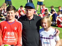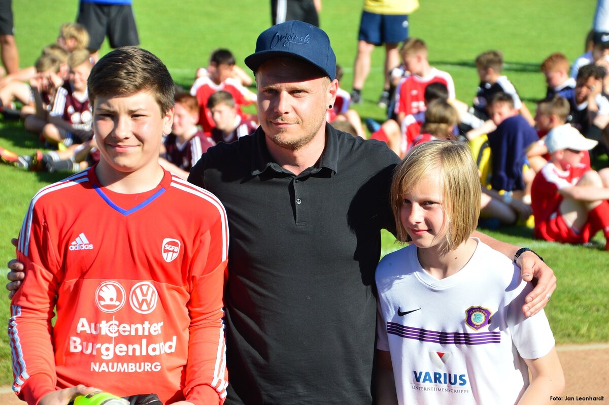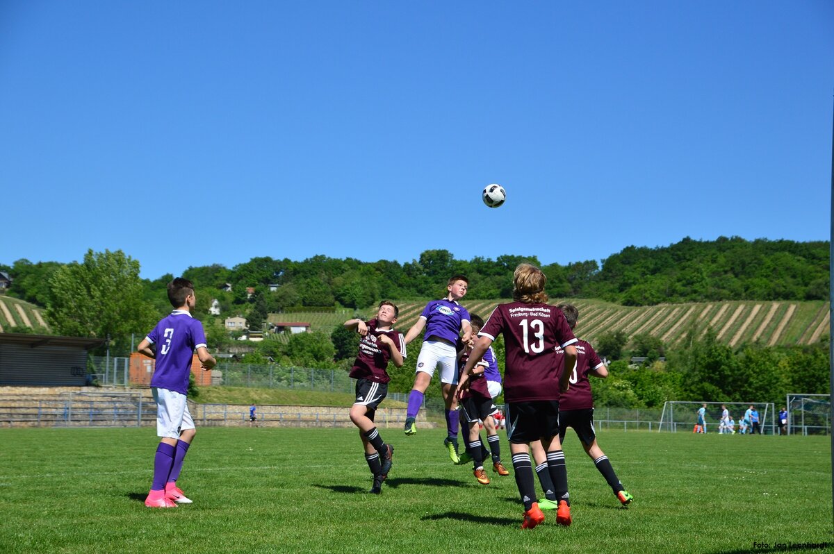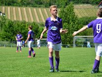 Am letzten Samstag starteten unsere 2005er ihre für die nächsten Wochen bevorstehende Serie von hochkarätig besetzten Turnieren und Leistungsvergleichen beim 43. Knabenturnier des FC RSK Freyburg im schmucken Jahnsportpark am Fuße der Weinberge der Sektstadt und legten einen sehr guten Auftritt hin. Nachdem das Team mit zwei Siegen gegen Freyburg und Wacker Gotha optimal ins Turnier gestartet war, hatte es im dritten Spiel die starken Dynamos aus der sächsischen Landeshauptstadt vor der Brust. In einem von beiden Seiten leidenschaftlich geführten Match hauten die jungen Veilchen alles raus, kämpften bei knapp unter 30 Grad Außentemperatur bis zur Erschöpfung und besiegten die schwarz-gelben am Ende knapp aber jederzeit verdient mit 1:0. Damit stand man bereits als Gruppenerster fest und zog ins Halbfinale ein. Davor gab es aber im vierten Gruppenspiel gegen den FC Carl Zeiss Jena noch einmal einen heißen Fight. Die Jenenser mussten unbedingt gewinnen und begannen wie die Feuerwehr. Nachdem das Team hier relativ schnell mit 0:1 hinten lag, steckte es aber nie auf und konnte durch Probespieler Luis Meyer ausgleichen. Nach einem individuellen Fehler in der Hintermannschaft bedankte sich der Gegner mit dem Siegtreffer und nach dem Spiel dafür, dass er mit ins Halbfinale einziehen durfte. Dort traf unsere U12 dann auf den späteren Turniersieger vom FC Rot-Weiß Erfurt. Auch hier entwickelte sich eine spannende und ausgeglichene Partie, welche die rot-weißen knapp mit 1:0 für sich entscheiden konnten. Im kleinen Finale schwanden dann die Kräfte der jungen Veilchen zusehends und man musste sich gegen einen robusten Gegner, der U13 des JFW Weißenfels mit 0:2 geschlagen geben und belegte am Ende einen sehr guten vierten Platz bei diesem tollen Turnier. Am kommenden Wochenende reisen unsere 2005er zum 6. DaDi Premium CUP des 1. FC Schöneberg in die Hauptstadt nach Berlin. In Freyburg spielten: Nico Weber (TW), Levin Leonhardt (1), Paul Börner, Luis Meyer (Probespieler/2), Samuel Urlaß, Noah Lenk, Tommy Stopp (C), Toni Wagenknecht, Lennart Kröber, Paul Schneider, Chris Giesel (2) und Kyra Spitzner (TW). Endplatzierung: 1. FC Rot-Weiß Erfurt 2. FC Carl Zeiss Jena 3. JFV Weißenfels (U13) 4. FC Erzgebirge Aue 5. Chemnitzer FC 6. Wacker 03 Gotha 7. SG Dynamo Dresden 8. SC Borea Dresden 9. TeBe Berlin 10. FC RSK Freyburg (U13) Foto 1: Teilnehmerfeld des 43. Knabenturniers des FC RSK Freyburg e.V. Foto 2: Probespieler Luis Meyer traf in seinem Debüt für die Veilchen gleich doppelt Foto 3: Samuel Urlaß war das beste junge Veilchen an diesem Wochenende Foto 4: Kyra Spitzner (rechts) wurde zum besten Keeper des Turniers gewählt