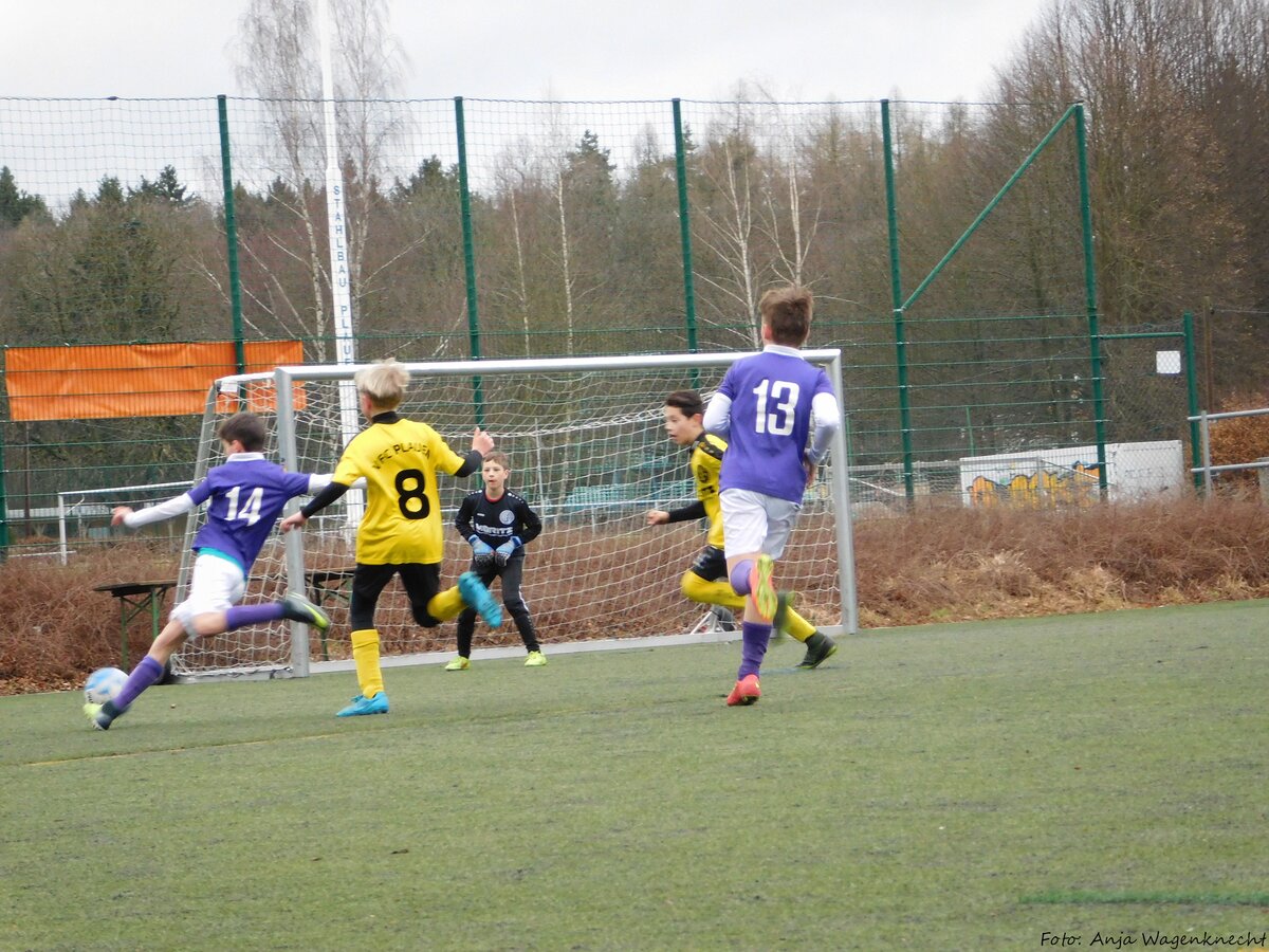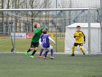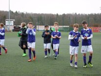 Am Samstag waren unsere 2005er beim Ligakrösus der Landesklasse West, bei der U13 des VFC Plauen zu Gast und zeigten gegen die körperlich mehr als überlegenen Spitzenstädter ein ganz starkes Spiel. Trotz der verdienten 2:0 Niederlage lieferte unsere U12 hierbei ihre bislang mit Abstand beste Saisonleistung ab. Bereits vor der Partie stellte das Trainerteam klar, dass es in diesem Spiel nicht um das Ergebnis geht, sondern vielmehr darum, wie man sich gegen einen übermächtigen Gegner verkauft. Und das taten die jungen Veilchen dann auch richtig gut. Sämtliche taktische Vorgaben wurden richtig umgesetzt und jeder einzelne Spieler hat die ihm übertragenen Aufgaben vollends erfüllt. Leider ging man nach einem mehr als fragwürdigen Freistoß an der Strafraumgrenze, der von einem über weite Strecken "unglücklich" agierenden Schiedsrichter verhängt wurde, schnell in Rückstand. Auch in der Folge musste man mit viel Glück und Geschick das eigene Tor verteidigen und kam kaum zu entlastenden Angriffen. Nachdem die an diesem Tag glänzend aufgelegte Torhüterin Kyra Spitzner eine Plauener Chance nach der anderen mit teilweise sensationellen Paraden entschärfte, fing man sich quasi mit dem Halbzeitpfiff recht unglücklich den zweiten Gegentreffer ein, womit der Endstand auch bereits hergestellt war. Denn im zweiten Durchgang setzte unser Team dann ganz klar ein richtungsweisendes Zeichen für die Zukunft, ließ keinerlei klare Aktionen der Plauener mehr zu und kam selbst immer wieder zu recht aussichtsreichen Angriffsmöglichkeiten. Mit etwas mehr Glück hätte man gegen Ende der Partie sogar noch den Anschlusstreffer erzielen können, nach einem solchen es mit Sicherheit auch noch einmal richtig spannend geworden wäre, in dieser Partie. Glückwunsch an unsere U12 zu dieser vor allem im defensiv taktischen Bereich extrem couragierten Leistung – weiter so junge Veilchen! In Plauen spielten: Kyra Spitzner (TW), Paul Börner, Noah Lenk, Tommy Stopp, Toni Wagenknecht, Lennart Kröber, Fabio Westerhof, Paul Schneider, Chris Giesel und Nico Weber (ETW). Foto 1: Trotz deutlichem Größennachteil machte Toni Wagenknecht eine richtig gute Partie Foto 2: Kyra Spitzner zeigte eine überragende Torhüterleistung Foto 3: Chris Giesel hatte kurz vor Schluss den Anschlusstreffer auf dem Fuß Foto 4: Am Ende trotz der Niederlage zu Recht nicht unzufriedene 2005er