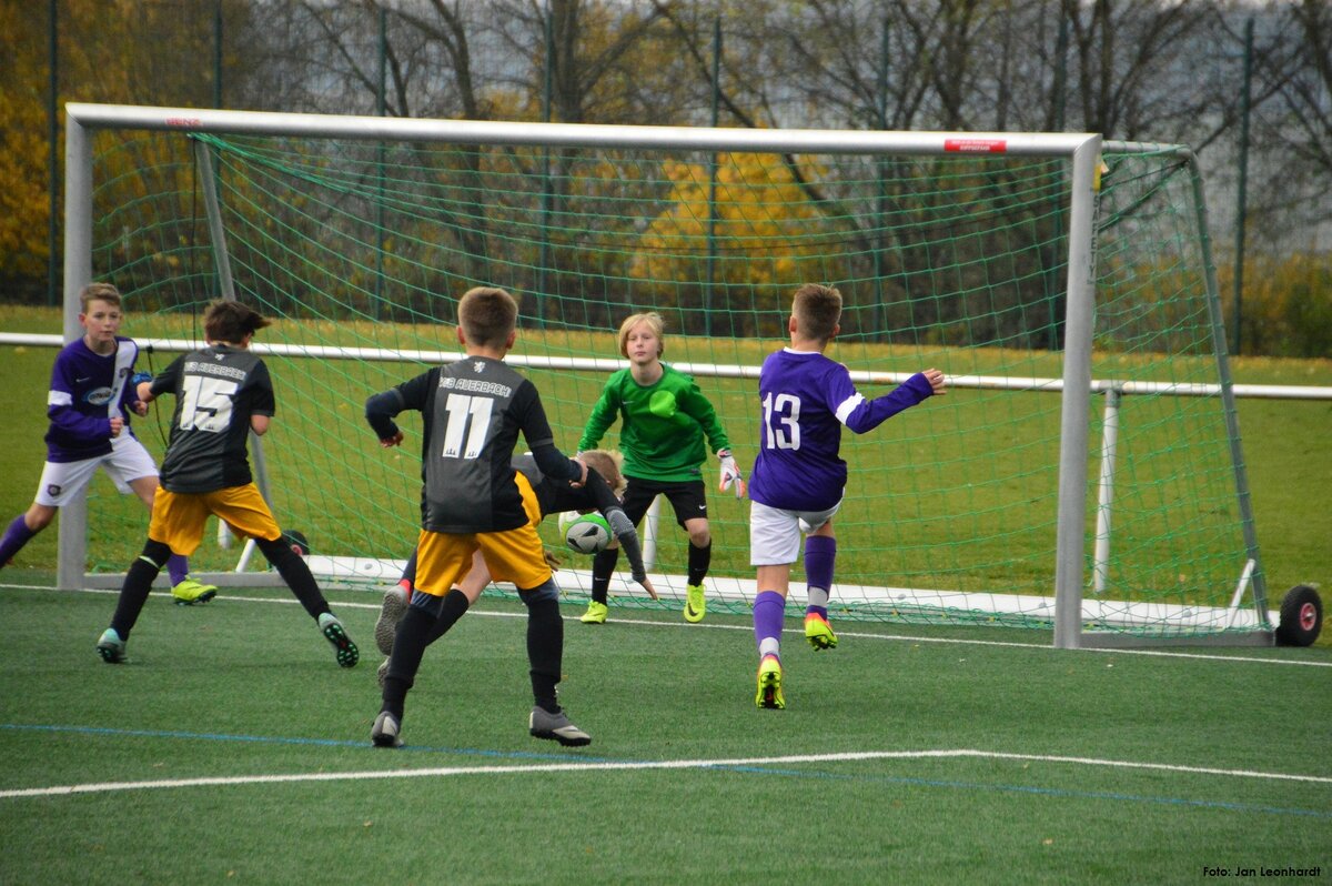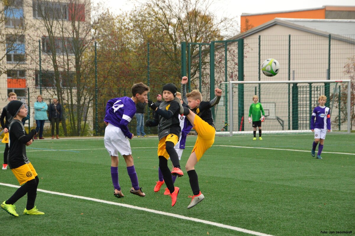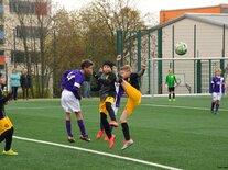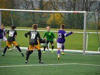 Unsere jungen D-Junioren waren am vergangenen Wochenende beim Spitzenteam der Landesklasse West, der U13 des VfB Auerbach, zu Gast. Die Jungs und vor allem Kyra als Lokalmatadorin hatten sich viel vorgenommen und gingen diese schwere Aufgabe konzentriert und mit viel Leidenschaft an. Auf dem neuen Kunstrasen an der Diesterweg-Grundschule in Auerbach entwickelte sich von Beginn an ein hochklassiges Nachwuchsspiel, das unser junges Team nicht nur lange offen hielt, sondern hier vielmehr auch den Ton angab. In der 25. Minute hätten die jungen Veilchen in Führung gehen müssen, als sie gleich eine Doppelchance aus Nahdistanz hatten, diese aber auch aufgrund des überragend haltenden Torhüters der Gastgeber leider nicht im Kasten unterbringen konnten. Die Auerbacher hatten da mehr Glück und erzielten durch einen tollen Kopfballtreffer nach einem Eckball und quasi mit dem Pausenpfiff das 1:0, was dann zugleich auch der Halbzeitstand war. Unbeeindruckt vom Gegentreffer spielte unsere U12 weiter einen guten Ball und belohnte sich in der 38. Minute mit dem 1:1 Ausgleich. Chris Giesel traf aus Nahdistanz mit dem Kopf. Danach spielten beide Teams voll auf Sieg und beeindruckten die vielen Zuschauer am Spielfeldrand mit einem packenden Match. Nur drei Minuten nach dem Ausgleich, haben die jungen Veilchen eine gute Chance in Führung zu gehen, vertändeln aber den Ball vorm gegnerischen Kasten und laufen in einen Konter, den die jungen Auerbacher eiskalt zur erneuten Führung nutzten. Aber auch danach gab sich unser Team nicht auf und drückte weiter auf den Ausgleich. Leider fehlte in der letzten Viertelstunde der Partie dann entweder die Durchschlagskraft vor dem gegnerischen Tor oder aber auch ein wenig Glück. In letzter Sekunde, als bereits der für Kyra Spitzner eingewechselte Torhüter Nico Weber mit aufgerückt war, nutzte der VfB einen abgewehrten Fernschuss von Noah Lenk zum Gegenstoß und erzielte mit dem Schlusspfiff noch einen Treffer zum 3:1 Endstand. Mit etwas mehr Glück und Geschick, wäre hier für unsere jungen D-Junioren auf jeden Fall ein Unentschieden drin gewesen. Da waren sich auch die Trainer beider Mannschaften nach dieser sehr fairen und freundschaftlichen Partie auf sehr hohem spielerischem Niveau absolut einig. In Auerbach spielten: Kyra Spitzner (TW), Levin Leonhardt, Paul Börner, Niklas Häcker, Samuel Urlaß, Noah Lenk, Tommy Stopp (C/1), Lennart Kröber, Paul Schneider, Chris Giesel (1) und Nico Weber (ETW). Foto 1: Der überragende Auerbacher Torhüter rettet wiederholt stark vor Paul Börner Foto 2: Konrad Lippmann vom VfB Auerbach köpft frei vor Paul Schneider zum 1:0 ein Foto 3: Chris Giesel setzt sich gleich gegen zwei Gegenspieler im Kopfballduell durch