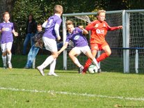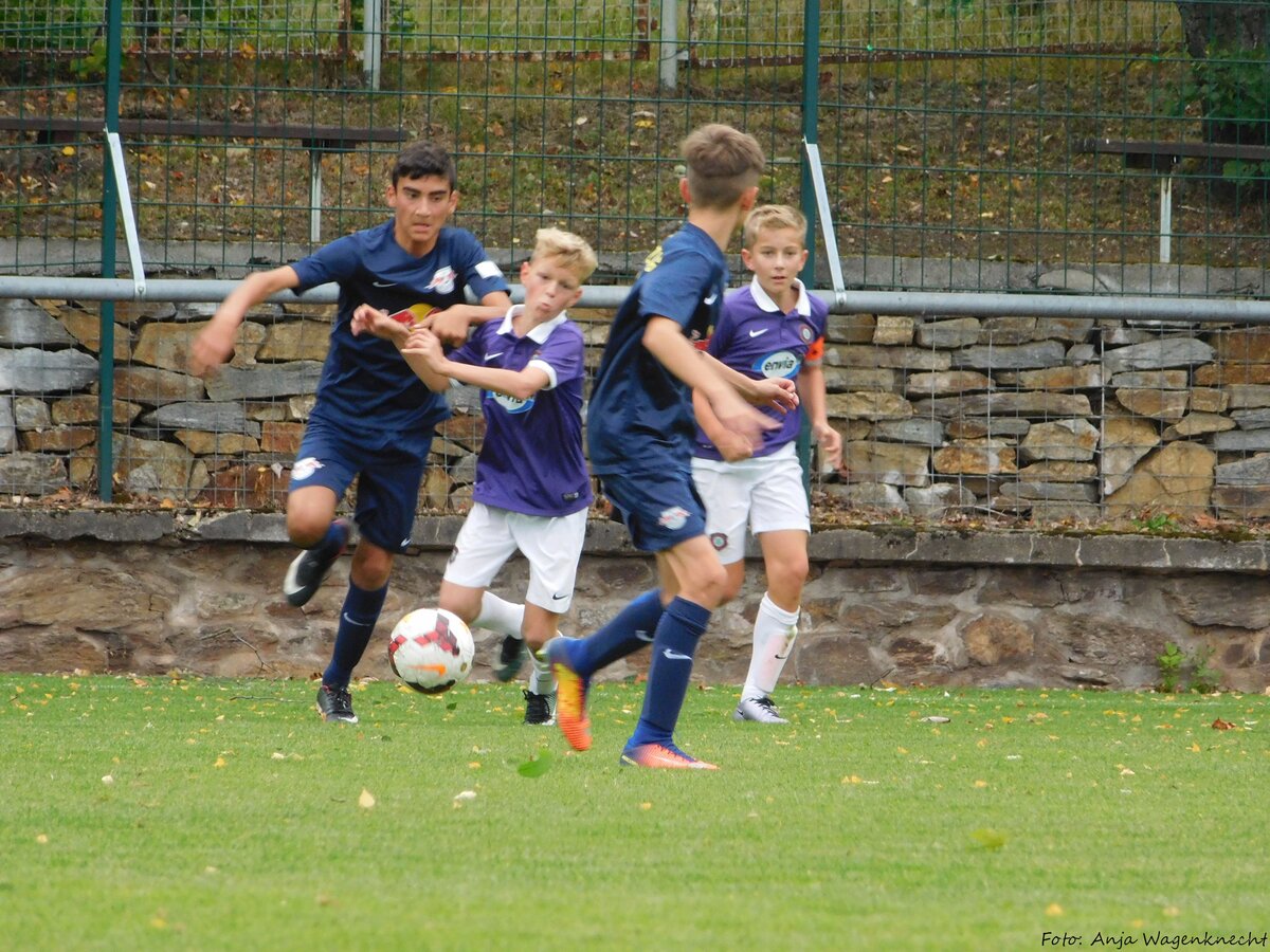 Nachdem unsere 2005er mit dem Unentschieden gegen den Chemnitzer FC und der deutlichen Heimniederlage gegen Ligakrösus RasenBallsport Leipzig erwartungsgemäß schwer in die neue Saison in der Talenteliga Sachsen gestartet waren, konnten sie am vergangenen Wochenende nach einer couragierten Leistung beim FSV Zwickau den ersten Dreier einfahren. Nach ausgeglichenem Beginn der Partie auf dem Cainsdorfer Rasenplatz rissen die jungen Veilchen von einer Spielminute zur anderen das Heft des Handelns immer deutlicher an sich, erzwangen sich mit viel positiver Mentalität und enormer Willensstärke auch das Glück des Tüchtigen und besiegten den Gegner Mitte der zweiten Halbzeit innerhalb von fünf Minuten. Dabei eröffneten die Zwickauer in der 45. Spielminute mit einem unglücklichen Eigentor selbst den Torreigen, ehe nur drei Minuten später Louis Meyer energisch gegen den Gegner presste und der Ball erneut im gegnerischen Kasten landete. Kurz darauf (49.) wurde Chris Giesel auf der linken Seite herrlich in Szene gesetzt, der seine Torchance eiskalt verwertete und den Endstand zum 0:3 aus Sicht der Gastgeber herstellte. Am Ende auch aufgrund der ganz starken Einstellung unserer 2005er ein mehr als verdienter Sieg, der das konsequente Ergebnis einer sehr guten Entwicklung in den letzten Wochen ist. Jetzt geht es für unsere U13 erst einmal in eine kurze Herbstferienpause, ehe sie am Sonntag, dem 15.10.2017 um 12:30 Uhr in Beierfeld den 1. FC Lokomotive Leipzig empfängt. In Zwickau spielten: Eik Salzbrenner (TW), Paul Börner, Konrad Lippmann, Jérémie Geisler, Samuel Urlaß, Noah Lenk, Tommy Stopp (C), Toni Wagenknecht, Lennart Kröber, Louis Meyer (1), Paul Schneider, Chris Giesel (1) und Nico Weber (ETW). Foto 1: Riesenfreude im Team nach dem Treffer zum 0:2 durch Louis Meyer Foto 2: Paul Schneider machte ein ganz starkes Spiel und war bestes Veilchen in Zwickau Foto 3: Die „Hämmer“ im Zwickauer Land – für unsere jungen Veilchen was ganz Großes! Foto 4: Samuel Urlaß stemmt sich mit aller Kraft gegen seinen Leipziger Gegenspieler