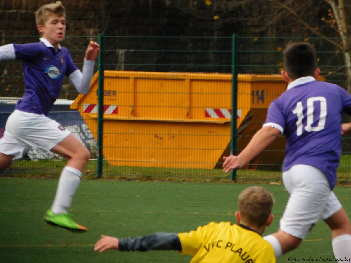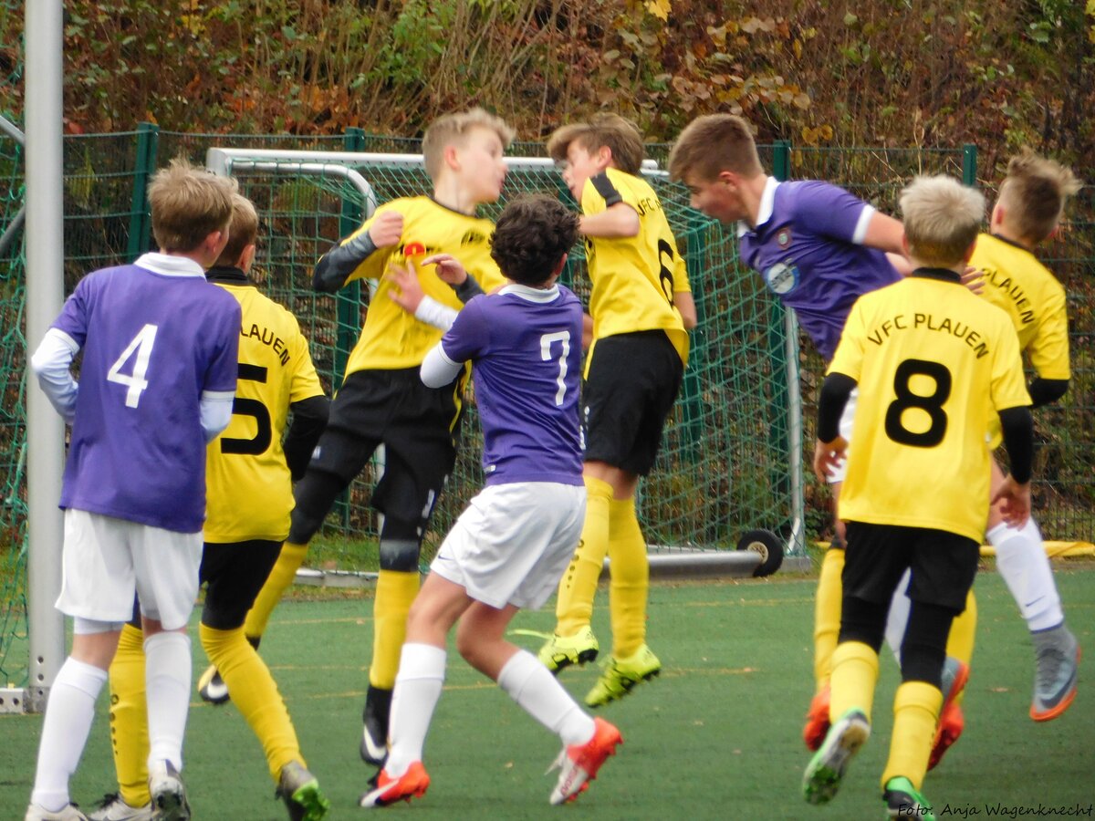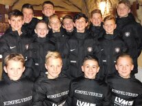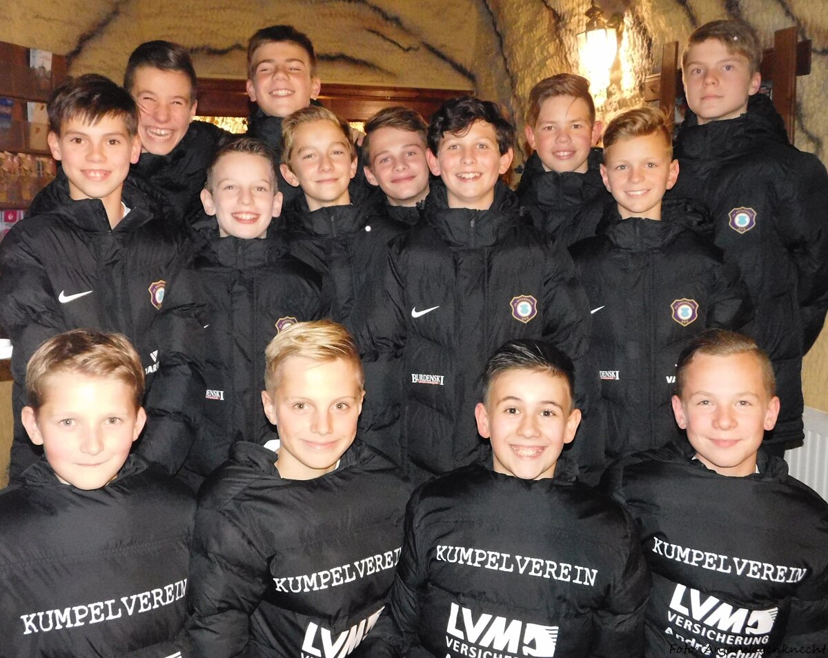 Nach der Punktspielpause am letzten Wochenende empfing unsere U13 zu Beginn einer „englischen Woche“ den VFC Plauen auf dem heimischen Kunstrasenplatz und zeigte eine über weite Strecken sehr überzeugende Leistung. Bereits in den ersten Minuten der Partie erspielten sich die jungen Veilchen sehr gute Chancen und hätten mit ein oder zwei Toren führen müssen. In der 23. Minute war es dann Louis Meyer, der einen Eckball von Tommy Stopp per Kopfball zum 1:0 verwertete. Kurz vor dem Wechsel setzte Jérémie Geisler energisch nach und stellte den 2:0 Halbzeitstand her. Im zweiten Durchgang dann das gleiche Bild. Unsere 2005er spielten weiter munter nach vorn und eine Torchance nach der anderen heraus. In der 41. Minute war es dann erneut Louis Meyer, der per Kopf auf 3:0 erhöhte, ehe Jérémie Geisler nur drei Minuten später nach einem klasse Konter von Lennart Kröber in Szene gesetzt wurde und mit seinem ebenfalls zweiten Treffer den 4:0 Endstand markierte. Mit diesem Sieg festigt unsere U13 ihren sehr guten 3. Tabellenplatz in der Talentliga Sachsen und feierte am Abend gemeinsam mit Eltern und Geschwisterkindern auf der anschließenden Weihnachtsfeier, auf der es dann neben viel Spaß und lecker Essen auch schicke neue Winterjacken für die Jungs von Sponsor LVM Versicherungen als Geschenk gab. Am Buß- und Bettag ist das Team dann bei der BSG Stahl Riesa zu Gast, ehe es am kommenden Wochenende zu den jungen Budissen nach Bautzen reist. Gegen den VFC Plauen spielten: Eik Salzbrenner (TW), Levin Leonhardt, Paul Börner, Konrad Lippmann, Jérémie Geisler (2), Samuel Urlaß, Noah Lenk, Tommy Stopp (C), Toni Wagenknecht, Lennart Kröber und Louis Meyer (2). Foto 1: Gut gestaffelte Reihe in Erwartung eines top getretenen Eckballs von Tommy Stopp Foto 2: Louis Meyer bei einem seiner beiden sehenswerten Kopfballtreffer Foto 3: Lennart Kröber schickt Jérémie Geisler zum 4:0 Endstand auf die Reise Foto 4: Neue Winterjacken – ein großes Dankeschön an die LVM-Agentur André Schult aus Lauter!
