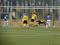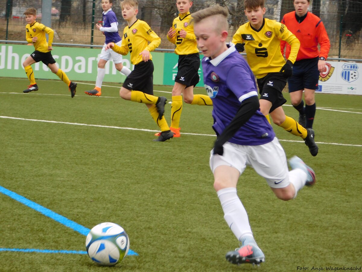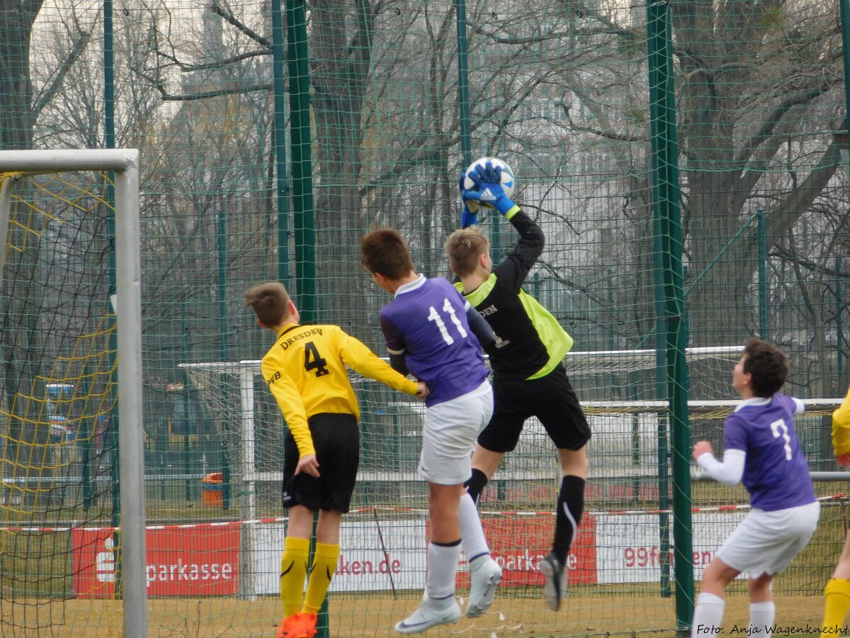 Im zweiten Punktspiel der Meisterrunde in der Talenteliga- Sachsen war unsere U13 bei Dynamo Dresden zu Gast und kehrte trotz einer starken Leistung mit leeren Händen zurück. Dabei starteten unsere 2005er sehr selbstbewusst in die Partie und brachten die gelb-schwarze Hintermannschaft das ein ums andere Mal arg in Bedrängnis. Leider konnten beste Einschussmöglichkeiten durch Lennart Kröber und Louis Meyer nicht genutzt werden bzw. wurden vom glänzend aufgelegten Dresdener Keeper teilweise sensationell gehalten. Aber auch der Torhüter unserer U13, Eik Salzbrenner, musste im weiteren Spielverlauf sein ganzes Können aufbieten und einige gute Möglichkeiten der Dresdner entschärfen. So ging es in einem temporeichen und hochklassigen D-Junioren-Spiel mit einem 0:0 in die Halbzeitpause. Im zweiten Durchgang spielten die jungen Veilchen weiter mutig nach vorn, standen hinten sicher und erarbeiteten sich weitere gute Möglichkeiten. Mitte der zweiten Halbzeit zeigte der sehr gute Schiedsrichter dann nach einem Handspiel auf den Elfmeterpunkt. Capitano Tommy Stopp übernahm Verantwortung und scheiterte aber leider auch hier am starken Dresdner Schlussmann, der den gut getretenen Strafstoß mit einer ganz starken Parade noch um den Pfosten lenken konnte. Danach entglitt unserer U13 ein wenig der Zugriff auf das Spiel, was von den jungen Dynamos eiskalt ausgenutzt wurde. Binnen zwei Spielminuten trafen sie gleich doppelt und entschieden so diese sehr intensiv aber sowohl auf dem Spielfeld als auch an der Seitenlinie äußerst fair geführte Partie für sich. Schade, junge Veilchen – hier war definitiv mehr drin! Am kommenden Samstag ist dann der FSV Zwickau zu Gast bei unseren 2005ern. In Dresden spielten: Eik Salzbrenner (TW), Paul Börner, Samuel Urlaß, Noah Lenk, Tommy Stopp (C), Toni Wagenknecht, Lennart Kröber, Louis Meyer, Tim Seifert, Paul Schneider, Chris Giesel und Nico Weber (ETW). Foto 1: Louis Meyer setzte sich wie hier mehrfach robust gegen seine Gegenspieler durch Foto 2: Winterneuzugang Tim Seifert fügte sich gut ins Mannschaftsgefüge ein Foto 3: Starke Parade des Dresdner Keepers beim von Tommy Stopp getretenen Strafstoß Foto 4: Auch in der Luft schnappt sich der Schlussmann die Kugel vor Louis Meyer