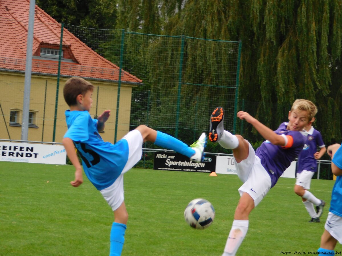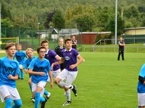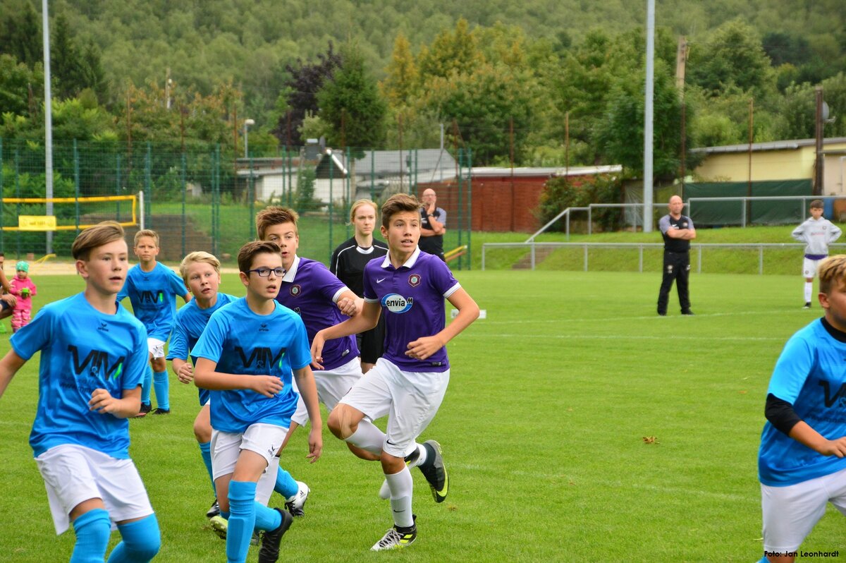Am 26. Juli begannen unsere 2005er die Vorbereitung auf die neue Saison in der Talenteliga Sachsen. Nach dem Trainingsauftakt in der Stadionhalle und einer ganzen Menge an Testspielen und Leistungsvergleichen ging es am zweiten Augustwochenende zum Kurztrainingscamp auf den Rabenberg, wo von Freitag bis Sonntag fleißig trainiert und getestet wurde. Den Höhepunkt nach mehreren Trainingseinheiten und einer gemeinsamen Mountainbike-Tour nach Tschechien bildete zum Abschluss einer intensiven Vorbereitung ein Leistungsvergleich mit den Teams von Borea Dresden und Fortuna Chemnitz. Am Samstag stand dann für unsere U13 das erste Pflichtspiel an, wo sie in der 1. Runde des Sachsenpokals beim 1. FC Wacker Plauen zu Gast war und mit einem souveränen 8:0-Sieg in die nächste Runde einzog. Nach einer ansprechenden Leistung gegen einen tapfer kämpfenden aber in allen Belangen unterlegenen Gegner sollte man trotz des deutlichen Ergebnisses die mangelhafte Chancenverwertung kritisieren. Am kommenden Wochenende steht dann für unsere jungen Veilchen erst einmal noch ein Testspiel gegen Soccer for Kids Dresden an, da der Punktspielauftakt in der Talenteliga Sachsen gegen den Chemnitzer FC auf Mittwoch, den 30.08.2017 verlegt wurde. Anstoß im Stadion am Spiegelwald zu Beierfeld ist dann um 17:30 Uhr. In Plauen spielten: Eik Salzbrenner (TW), Levin Leonhardt, Paul Börner, Konrad Lippmann (1), Samuel Urlaß, Noah Lenk (1), Tommy Stopp (C/1), Toni Wagenknecht, Lennart Kröber (1), Louis Meyer (4), Paul Schneider, Chris Giesel und Nico Weber (TW). Foto 1: Toni Wagenknecht setzt einen tollen Kopfball nur knapp neben das Plauener Tor Foto 2: Paul Börner und Neuzugang Louis Meyer erwarten hochkonzentriert einen Eckball Foto 3: Levin Leonhardt konnte sich mehrfach sehr gut durchsetzen, blieb aber ohne Treffer Foto 4: Wie immer voller Einsatz von „Capitano“ Tommy Stopp