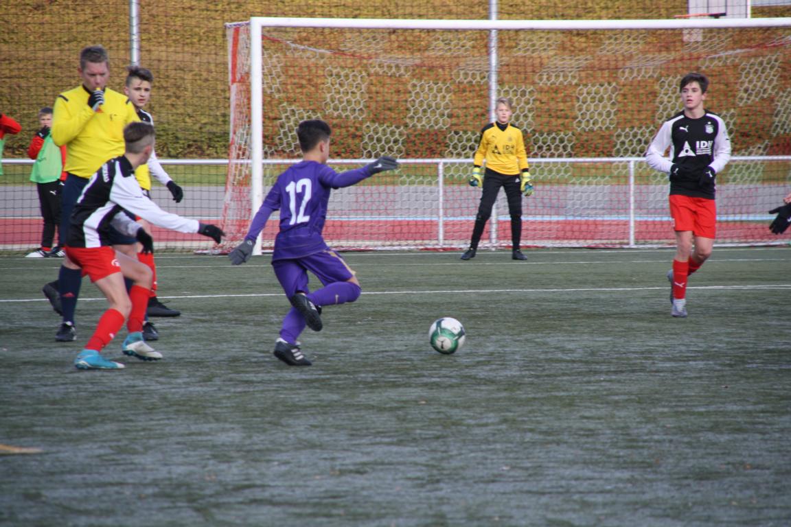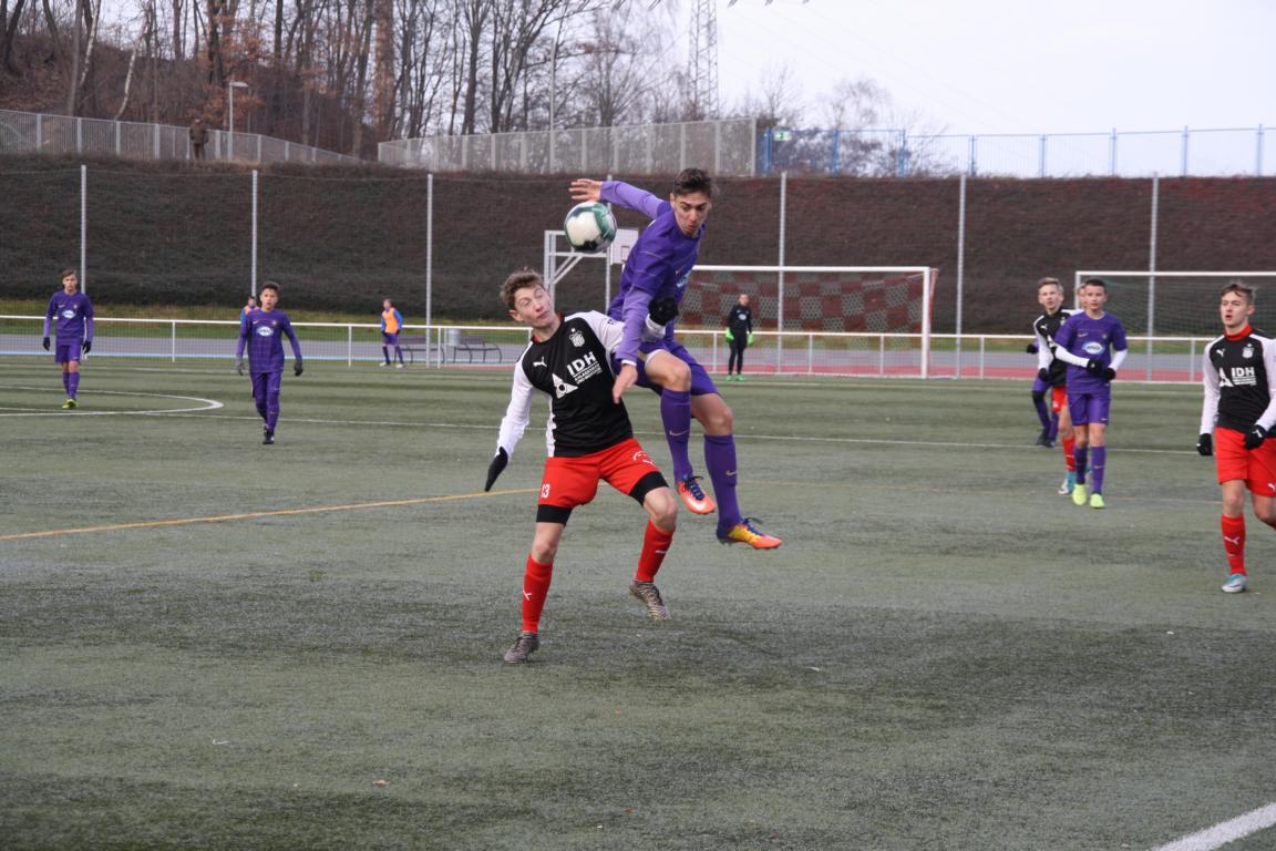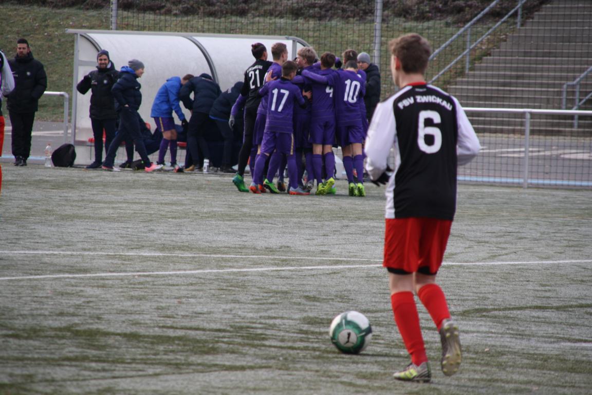 Am Sonntag stand das Derby beim FSV Zwickau auf dem Programm unserer U15. Bei eisigen Temperaturen knapp unter 0 Grad und gefrorerenem Kunstrasenplatz ging es für unsere Elf um weitere enorm wichtige Punkte im Kampf um die oberen Tabellenplätze.Wir erwischten einen sehr guten Start ins Spiel und suchten direkt den Weg Richtung Tor der Gastgeber. In der 3. Minute trat Toni Gaschler einen Freistoß aus 22 Metern zentraler Position vorm Kasten der Zwickauer. Dieser saß perfekt im linken oberen Eck und somit ging man sehr zeitig in dieser Partie in Führung.In der Folgezeit ließ man in der Defensive wenig anbrennen und versuchte immer wieder über schnelles und zielgerichtetes Kombinationsspiel zu weiteren Chancen zu kommen. Doch es gelang unseren jungen Veilchen nicht aus diesen Möglichkeiten Profit zu schlagen, wodurch es mit der 1-0 Führung in die Pause ging.Nach Wiederanpfiff ergab sich ein ähnliches Bild wie in den ersten 35 Minuten. Felix Hache traf mit einem schönen Distanzschuss zunächst nur die Querlatte. Kurze Zeit später machte er es besser. Er verwandelte einen Freistoß aus 18 Metern direkt ins Tor der Zwickauer. Mit dieser 2-0 Führung war der kurzweilige Ansturm der Gastgeber gebrochen und unsere U15 erhöhte durch eine sehenswerte Kombination zum 3-0.Der eingewechselte Nick Krämer wurde auf der rechten Bahn sehr schön freigespielt und legte uneigennützig im Sechzehner quer, wodurch Toni seinen zweiten Treffer in diesem Spiel erzielen konnte. Dies war gleichzeitig der Endstand in dieser Partie und unsere Jungs konnten sich über einen verdienten Auswärtssieg freuen.In dieser Woche wartet ein weiteres Derby auf unsere Mannschaft. Am Sonntag kommt die U14 vom Chemnitzer FC ins Lößnitztal. Im letzten Ligaspiel des Jahres wollen wir den positiven Trend weiterhin fortsetzen und den Gästen am Sonntag um 12.30 Uhr das Leben so schwer wie möglich machen und die 3 Punkte im Erzgebirge behalten.