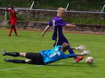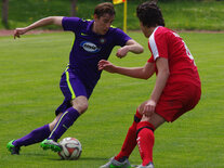 Die A-Junioren des FC Erzgebirge Aue haben gegen den Tabellenletzten klar mit 5:0 gewonnen und damit vorerst die Abstiegsplätze verlassen. Trainer Enrico Kern bot heute mit Kevin Walther, Sascha Härtel, Vincent Michl und Noah Lukic gleich vier B-Junioren in der Startelf auf, welche auch gleich für mächtig Wirbel sorgten. Es dauerte eine knappe halbe Stunde bis die Auer ihre Dominanz in Tore ummünzten. Dabei brachte Noah Lukic, einer der B-Junioren in der Startelf, die Veilchen mit seinem Doppelschlag auf die Siegerstraße. Erst um kurvte er Schlussmann Nico Fischer (32.) und dann zog er trocken von der Strafraumgrenze ab (33.). Im zweiten Abschnitt erhöhte er auf 3:0 (54.). Auch die anderen beiden B-Junioren in der Startelf trugen sich noch in die Torschützenliste ein. Erst Kevin Walther aus knapp 16 Meter und dann machte es Vincent Michl wie Noah Lukic zum 1:0, als er ebenfalls Nico Fischer um kurvte und zum 5:0 einschob. Trainer Enrico Kern war zufrieden mit der Leistung seiner Mannschaft und man will den letzten Strohhalm zum Klassenerhalt ergreifen. Dazu müssen in den letzten 3 Spiele Siege her. Am nächsten Samstag kommt der 1.FC Magdeburg nach Beierfeld, danach geht es zu Hertha Zehlendorf und am letzten Spieltag gastiert der Hallesche FC im Spiegelwaldstadion. (SC) Aufstellung:Kenny Daniel Hoyer, Florian Stier, Jan Lange, Kevin Walther (C), Sascha Härtel, Vincent Michl, Noah Lukic (67. Max Prügner), Kilian Müller, Chris Söllner (74. Patrise Gjocaj), Paul Johannes Günther, David Oxenfart (74. Fatih Boynügrioglu)Tore:1:0 Noah Lukic (32.) 2:0 Noah Lukic (33.) 3:0 Noah Lukic (54.) 4:0 Kevin Walther (72.) 5:0 Vincent Michl (89.)Zuschauer:73 im Stadion am Spiegelwald in Beierfeld Text+Fotos: Steffen Colditz