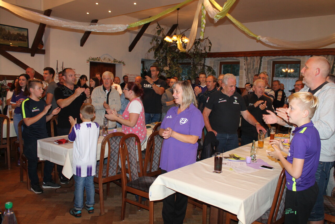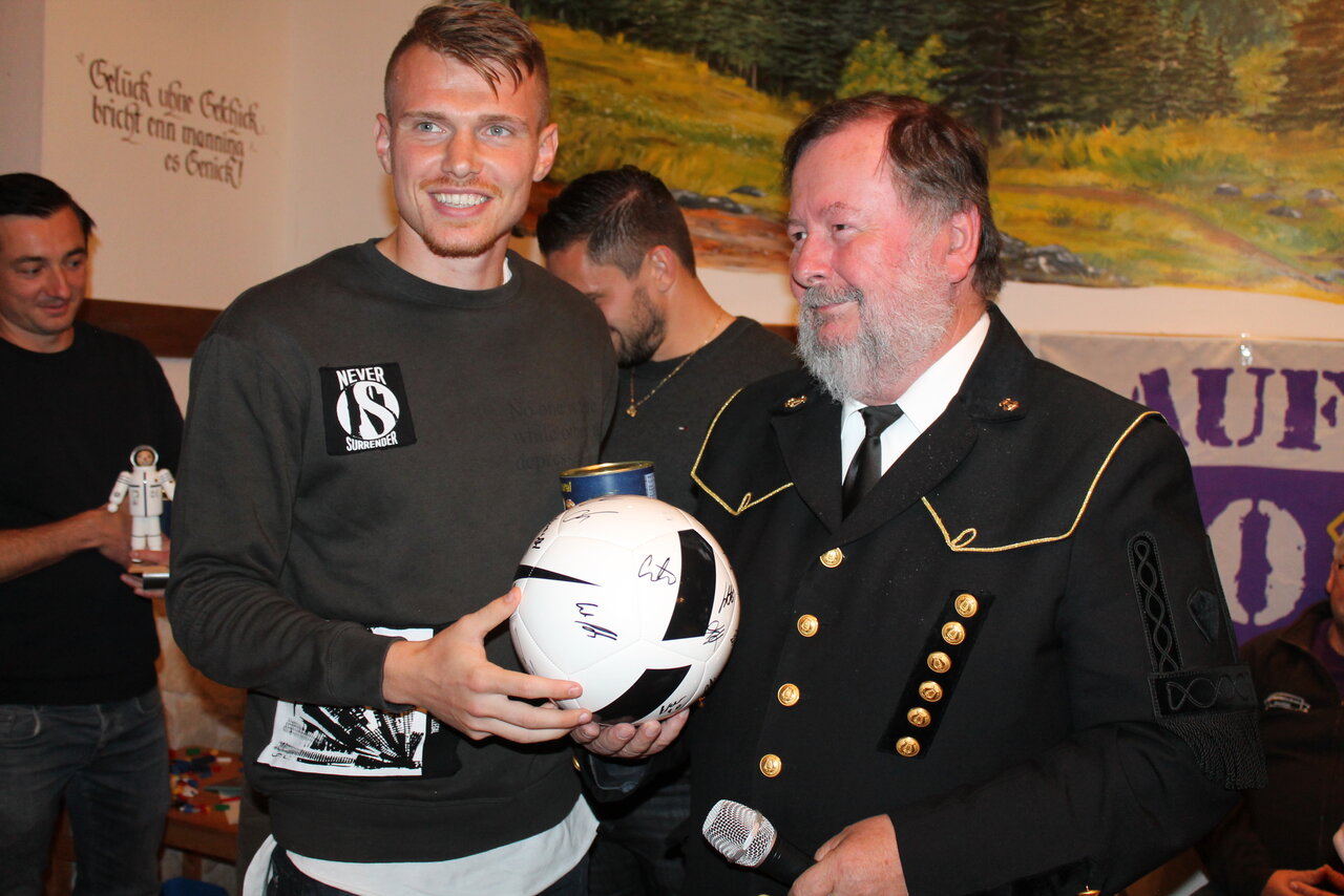 Gekommen waren an dem Dienstagabend über 80 Veilchenfreunde, die mit Cheftrainer Daniel Meyer und den Spielern Steve Breitkreuz, Clemens Fandrich und Pascal Testroet fachsimpeln wollten. Begrüßt wurden sie zünftig mit dem Steigermarsch.