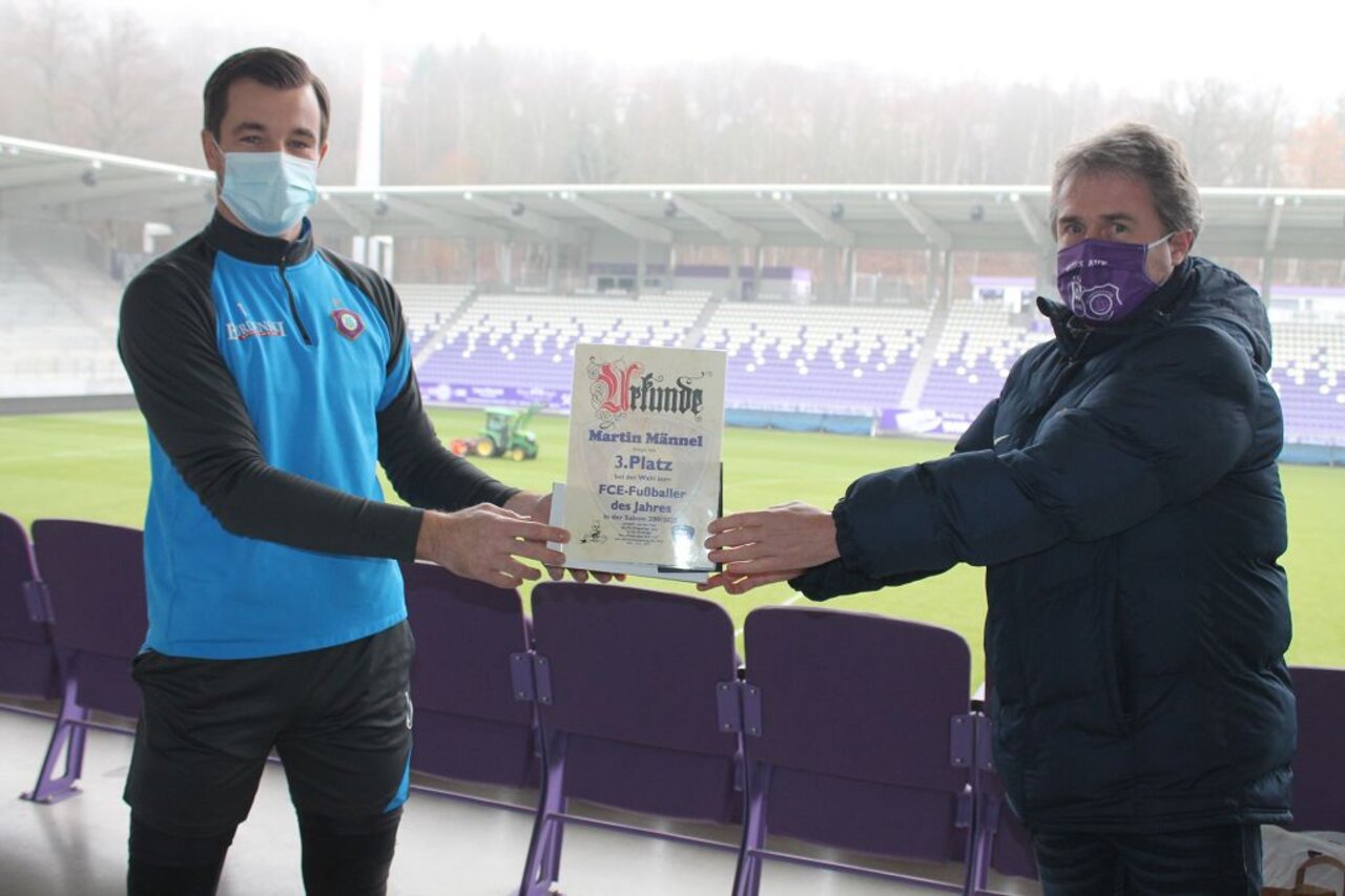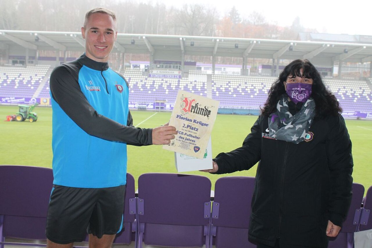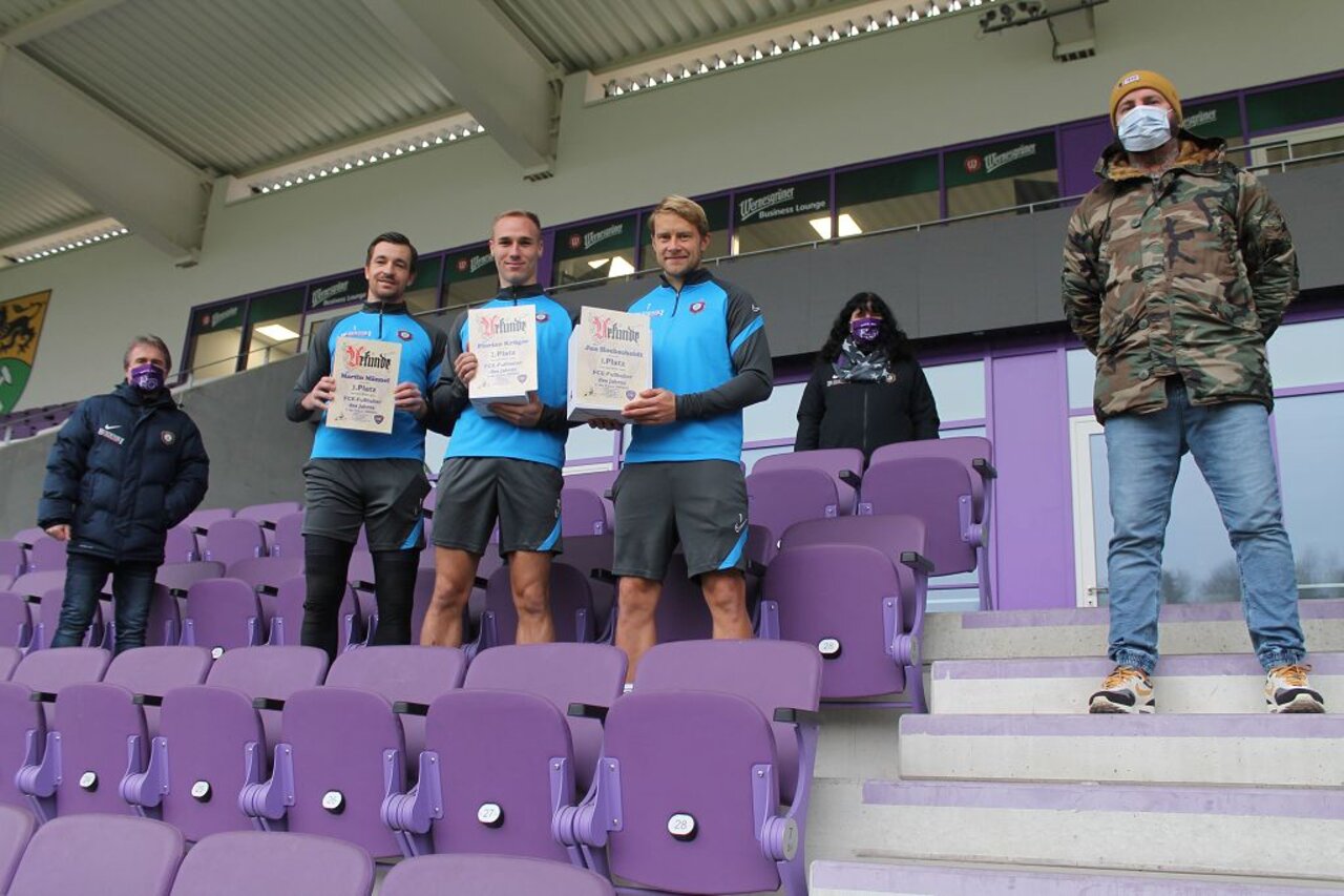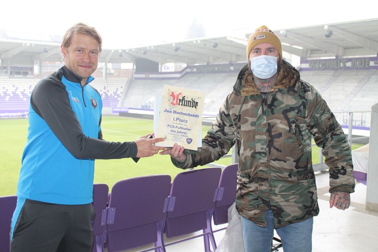 Das Sieger-Trio ehrten am 10. Dezember Michael Scheffler und Karolin Hambeck vom Fanprojekt (FP) sowie Fanbeauftragter Heiko Hambeck. Als Preise mitgebracht hatten sie von „Karo” gestaltete Urkunden plus vom FP spendierte große „Raachermanneln” aus dem Veilchen-FanShop. Jan freute sich zudem über eine Karikatur, die traditionell der Erstplatzierte erhält. „Das Unikat stammt aus der Werkstatt des Lößnitzer Tätowierers Martin Tröger”, verrät Michael Scheffler. „Die Wahl des Spielers des Jahres beziehungsweise der Saison führen wir seit 1998 durch, der erste Gewinner damals war ,Fußballgott’ Steven Zweigler”, schaut der FP-Leiter zurück und erwähnt auch das aktuelle Titel-Duell zwischen Jan und Martin. „Hochscheidt vier, Männel drei lautet der aktuelle Stand. Florian Krüger schaffte es erstmals unter die ersten drei, ihm und einigen anderen traue ich für die aktuelle Saison gleichfalls eine Menge zu.” Heiko Hambeck bedauert, die Ehrung nicht vor vollem Haus zu einem Zweitligaspiel präsentieren zu dürfen: „Corona hat uns einen Strich durch die Rechnung gemacht. Trotzdem konnten Jan, Florian und Martin wieder drei Umfrageteilnehmer glücklich machen. Unter allen Teilnehmer zogen sie die Namen von drei Fans. Sie werden von uns per E-Mail benachrichtigt.”