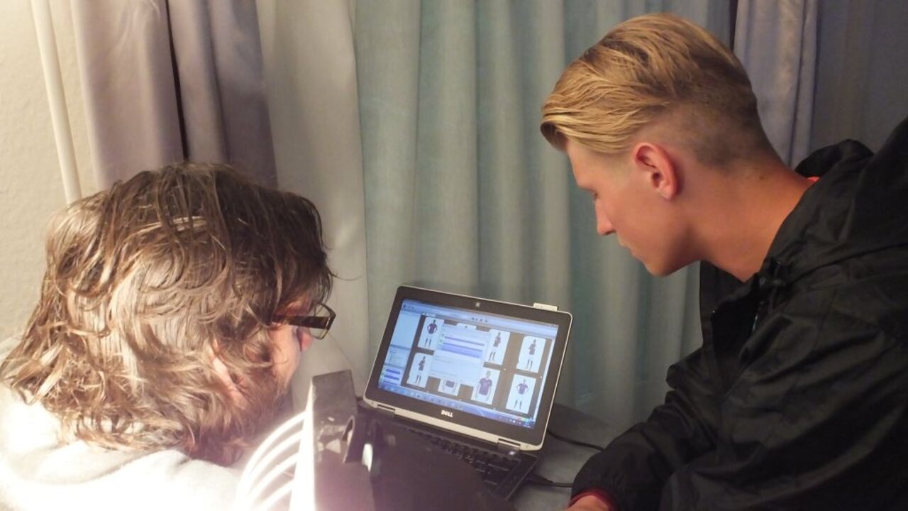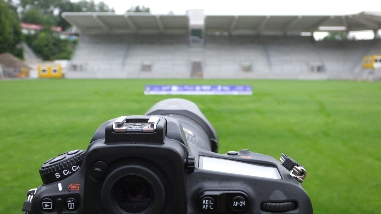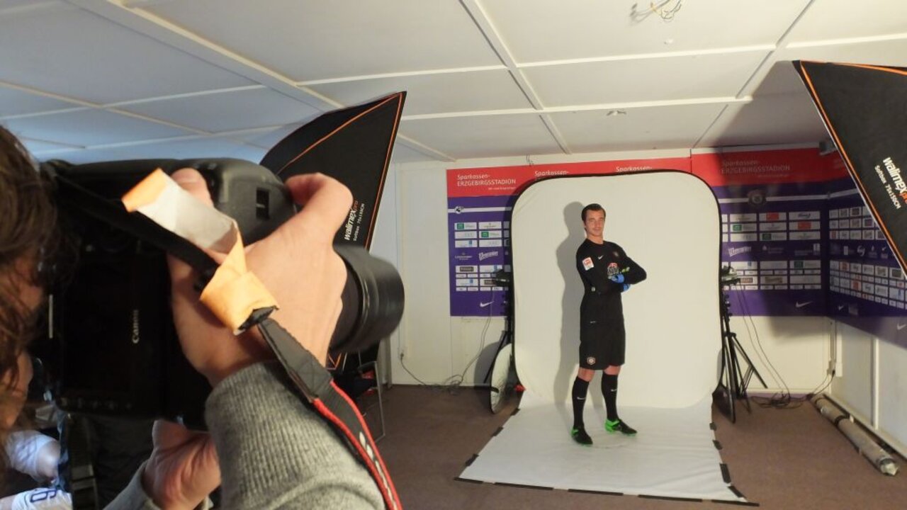 Und hier schaut Robert Jendrusch dem Berliner Fotografen Boris Streubel bei der Arbeit zu, der im Auftrag der DFL die Einzelporträts unseres Teams auf den Weg brachte.
