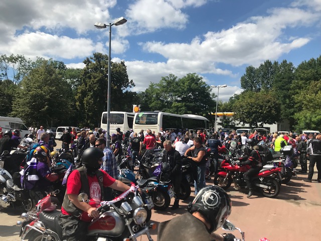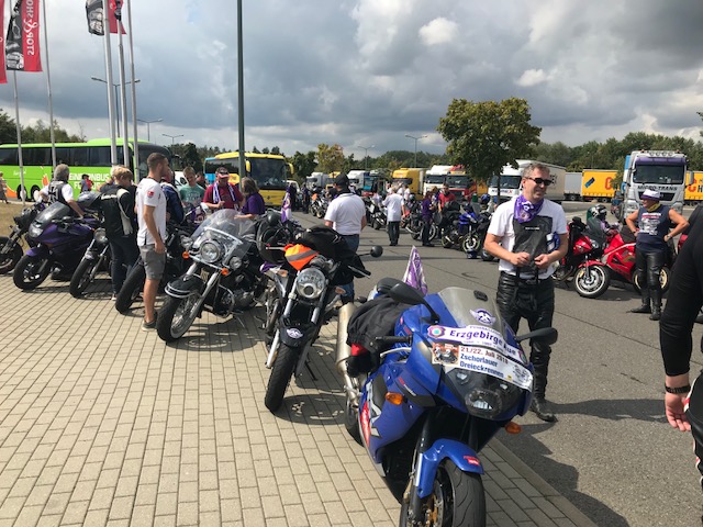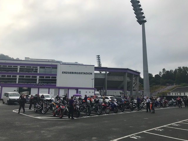 Bei bestem Wetter ging es zur 5. Veilchen-Biker Tour zum 2. mal mit den Bikes zu den „Eisernen“ nach Berlin. Sonntag, 5.August 2018 früh um 9 Uhr: über 50 Lila-Weiße Biker und 2 Begleitfahrzeuge machten sich auf die 280 km lange Strecke. Unterwegs schlossen sich über 10 weitere Motorräder an. Ab dem 2. Stopp in Freienhufen begleitete uns ein erster eiserner Trupp mit ca. 10 Bikern. Letzte Rast vor der Fahrt zum Stadion war an der Berliner Paradiesstraße. Eine Stärkung gab‘s mit Polnischer vom Leuthäuser Fleischer aus Hohndorf , dem Bauer Fleischer aus Albernau, Semmeln vom Schelli aus Aue und Mineralwasser vom Getränke Pausch aus Lauter. Hier stießen weitere 35 „Eiserne Biker“ dazu. Eine herzliche Begrüßung unter Fußball – und Bikerfreunden und dann ging es mit über 100 rot-weißen und lila-weißen Motorräder durch Köpenik an den vielen Berlin- und Aue Fans vorbei zur „Alten Försterei“. Beifall und Jubel beider Fanlager hinterließen Gänsehaut !! Die „Eiserne Biker“ spendierten, bei dann schon „erhöhten“ Temperaturen, noch kühle „Kaltschalen“ bei der Ankunft. Na ja, zum Spiel sei an der Stelle nichts weiter gesagt. Dank an unsere Veilchen-Biker-Teilnehmer für eine disziplinierte Fahrt, die alle das Ziel Alte Försterei auf zwei Rädern erreicht haben. Dank auch an die Profi-Blocker in den orangen Westen, die zur Sicherheit der Tour beigetragen haben, das Begleitteam, den helfenden Händen vom FCE und allen, die schon fleißig ihre Fotos und Videos von unserer Tour ins Netz gestellt haben. Glück Auf Stüb - Uwe Stübner und Mich - Michael Rüdiger im Namen des Vorstandes des Förderkreises und des FC Erzgebirge Aue e.V. Text, Fotos & Video: Veilchen-Biker Privates Video: