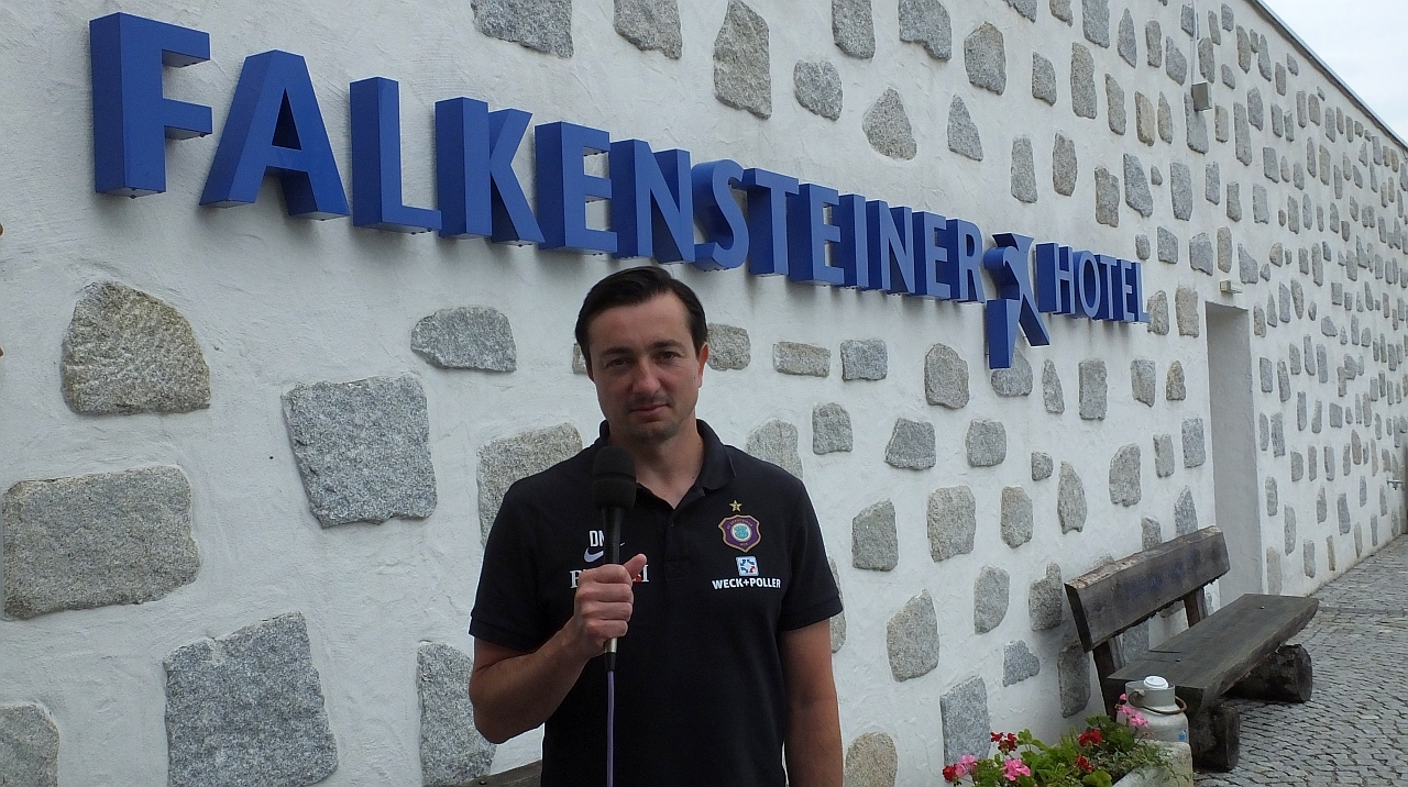 Nach dem Mittagessen wurden die Quartiere bezogen. Und noch vor dem Training am Nachmittag war unser Chefcoach Daniel Meyer am Veilchen-Mikrofon, um uns ein paar Neuigkeiten zu verraten.